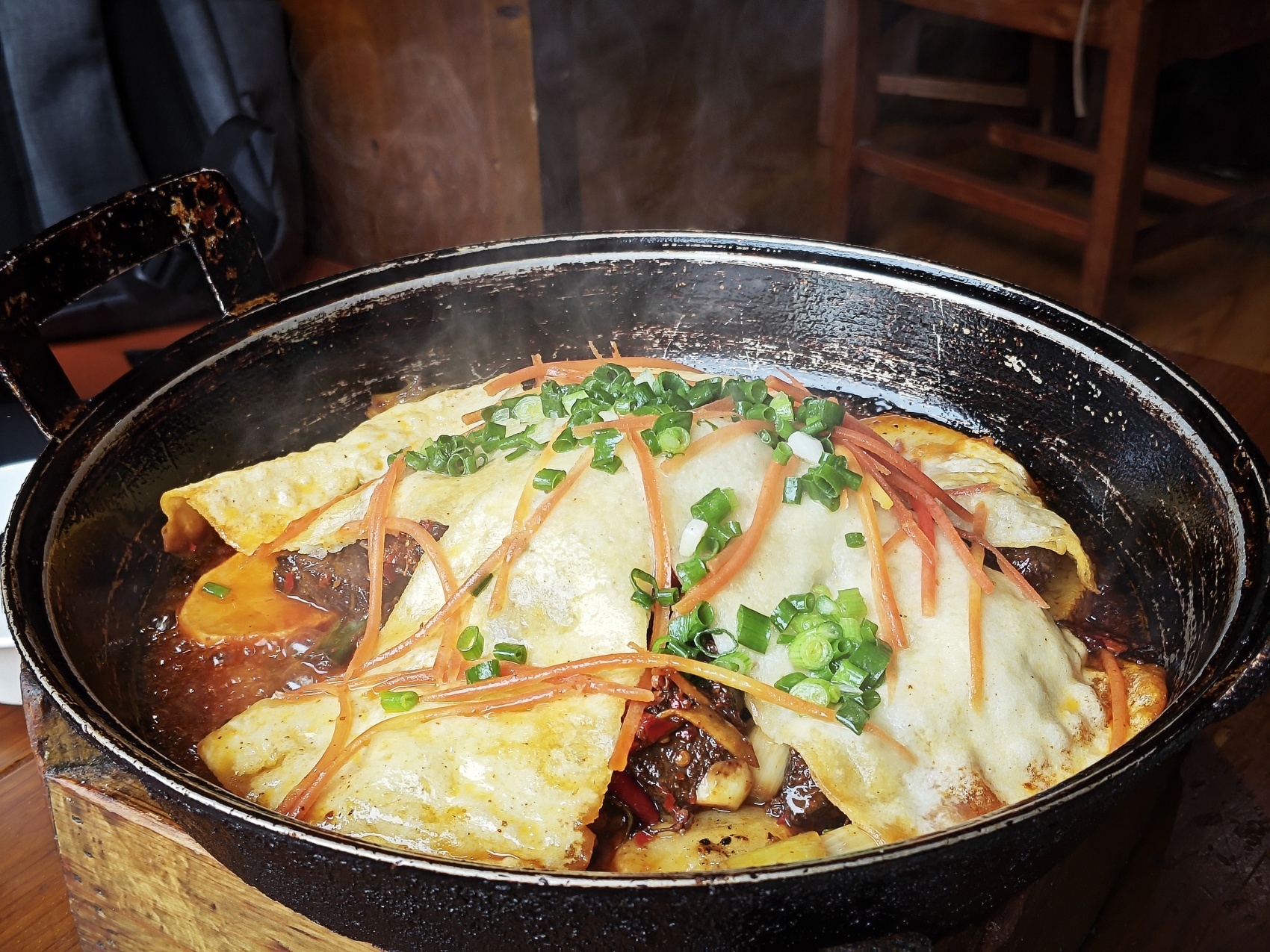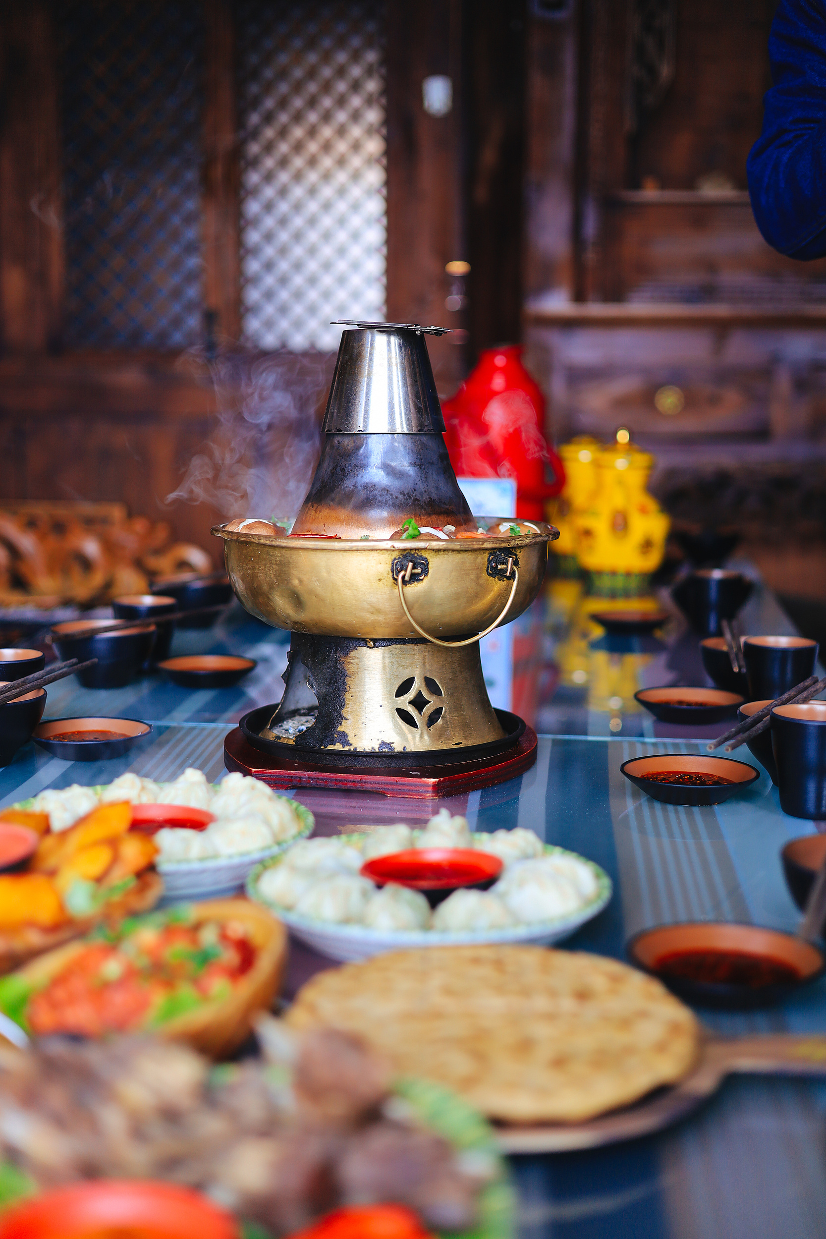 “玛拉亚藏餐厅”和“玛吉阿米餐厅”则在传统菜式中寻找新的切入口。前者以藏式牦牛肉包子出圈,青稞与面粉混合的面皮保留粗粮香气,内馅扎实,满足感极强;后者的牦牛肉汤锅以高原香料慢炖,汤色奶白醇厚,加入野生菌与本地蔬菜,使传统汤锅更具层次感,也更适合社交式用餐。加之靠河的观景位置,使“吃藏餐”本身成为一种完整的旅行体验。