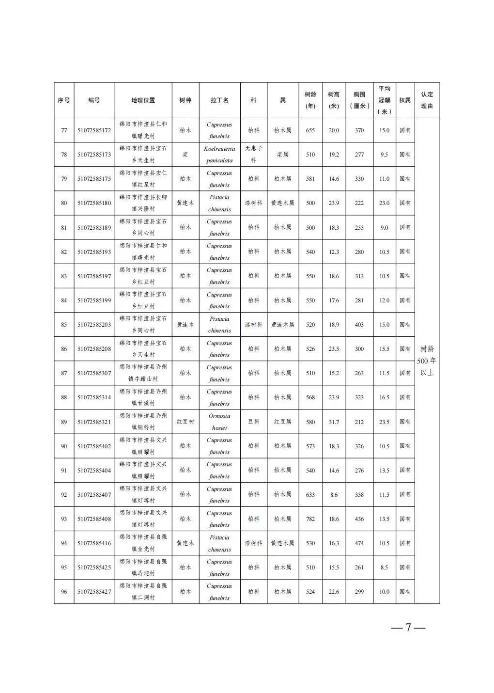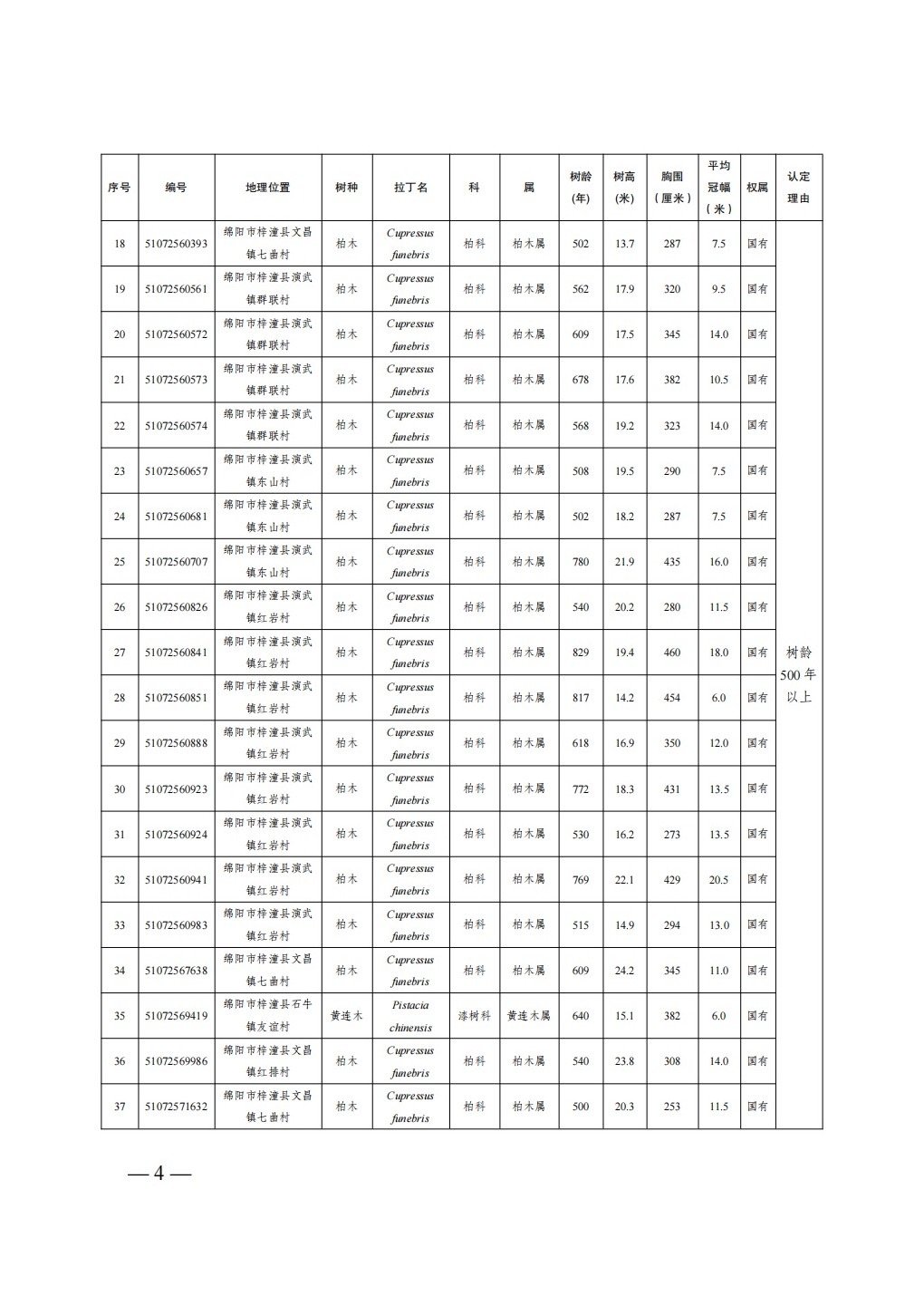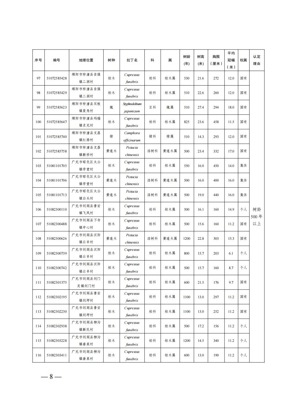 根据《古树名木保护条例》,一级古树树龄在500年以上。此次新增的一级古树主要分布在绵阳市、广元市、乐山市、阿坝藏族羌族自治州以及甘孜藏族自治州。新增的名木树种为木樨,又称桂花,位于乐山市井研县研经镇研经街社区,该株桂花树为中国近代史名人熊克武于1910年亲手栽植。