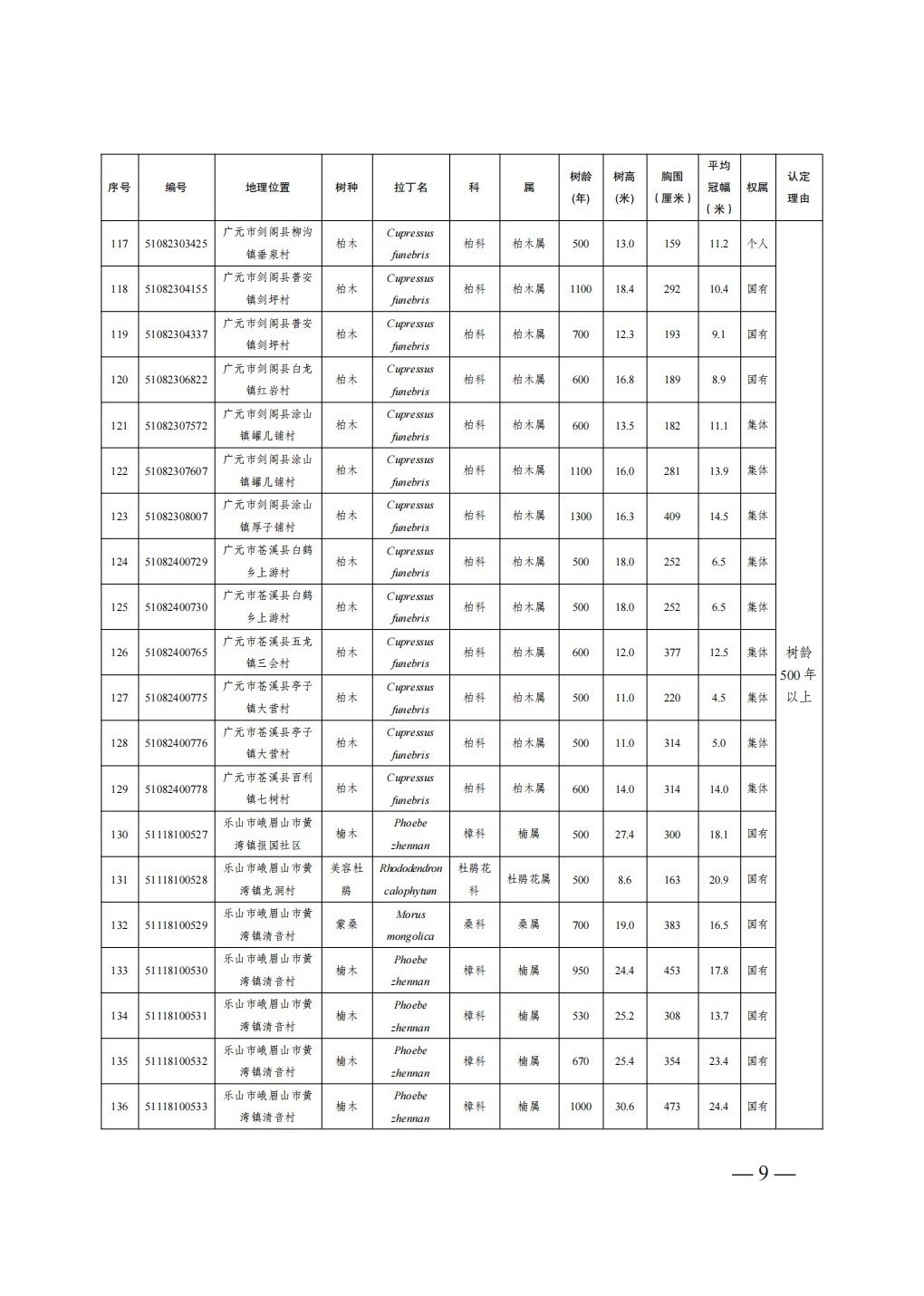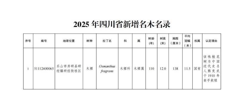 名木的认定要求则严格许多。名木是指具有重要历史、文化、科学、景观价值或者具有重要纪念意义的树木。“在2025年,申报名木的树木一共有5棵,但经过综合考虑,从重要性和权威性上考虑,最终只认定了乐山市的这一棵树。”李守剑说,至此全省的名木数量达到了98棵。
