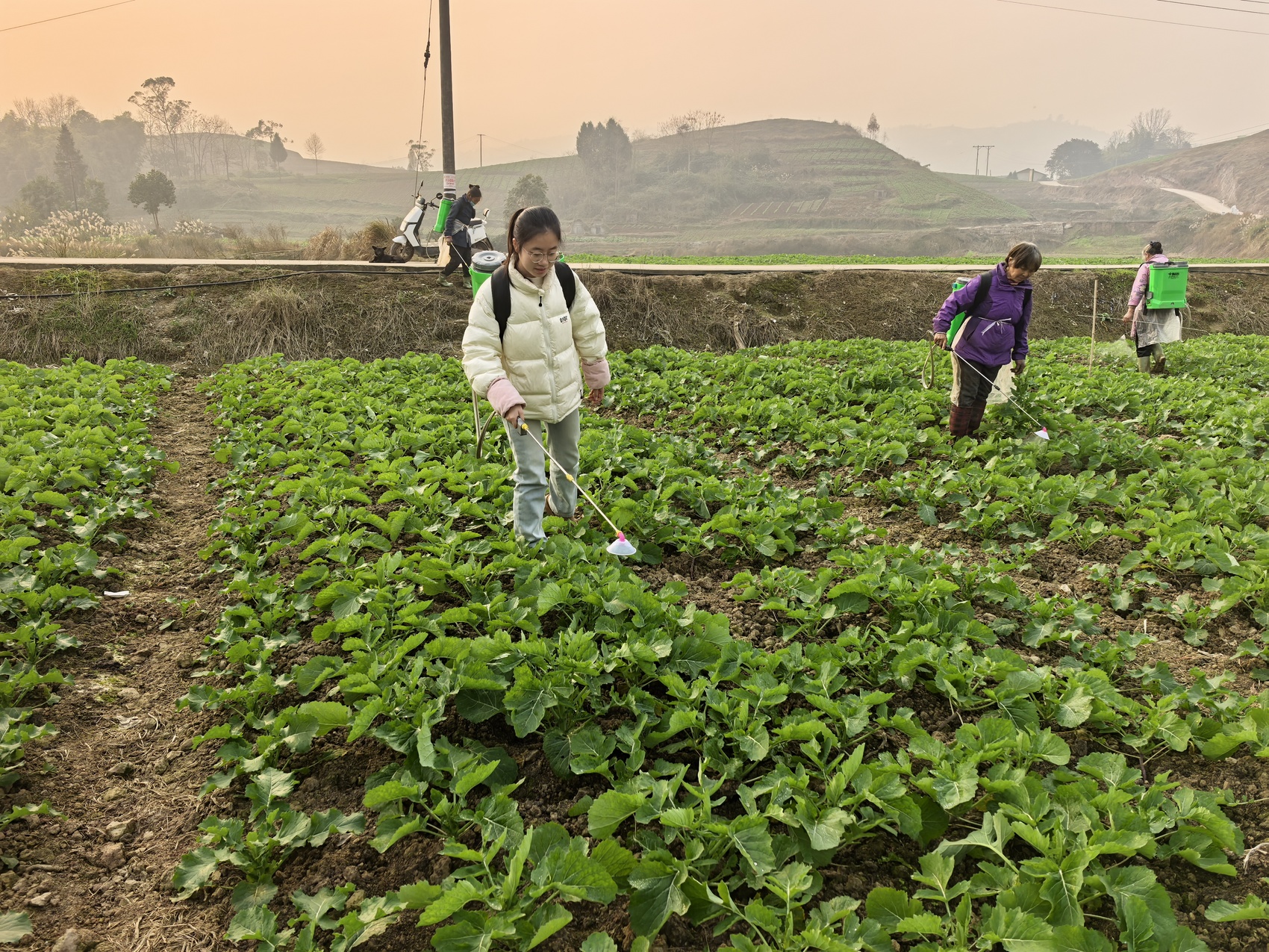 冯荧萍(左一)手持喷枪,为“广油一号”油菜制种幼苗化杀、除杂。