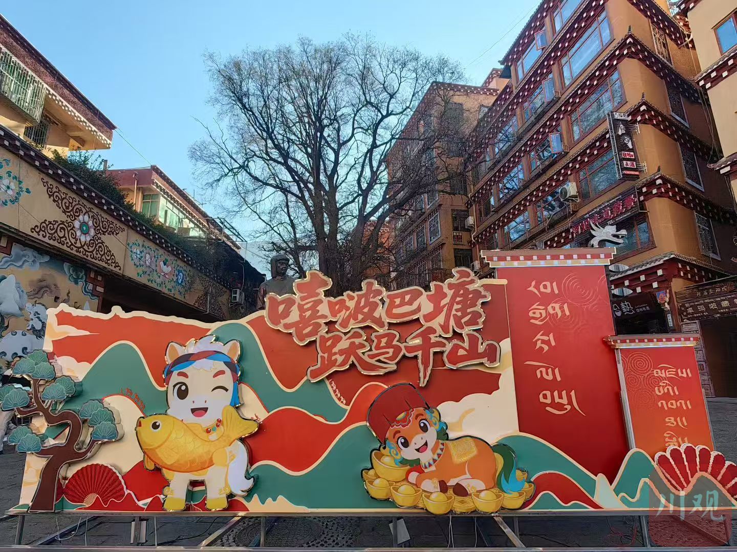 中山广场上,两座马年生肖景观小品成为今年氛围营造的亮点。吉祥物以巴塘传统服饰为设计灵感,头戴特色“索哈”红帽、佩戴藏式项链,一马拱手拜年、一马奔腾向前,手持“马年大吉”祝福标语,将本土文化与新春元素巧妙融合。