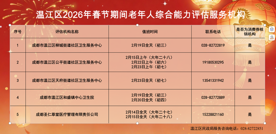 此外,春节期间,柳城街道社区卫生服务中心等5家机构可为老年人提供综合能力评估服务,有需求的老年人及家属可结合机构值班时间咨询评估。