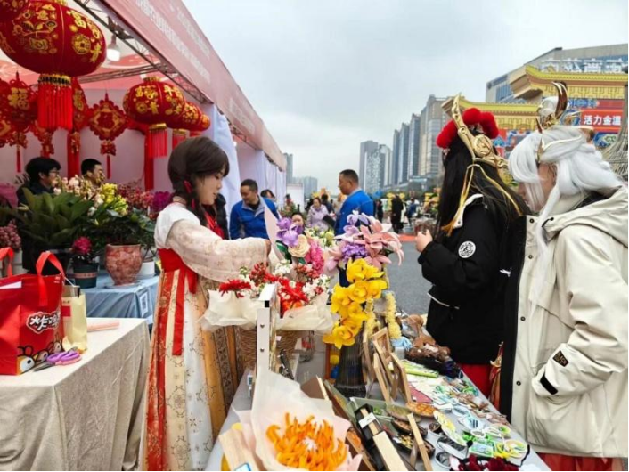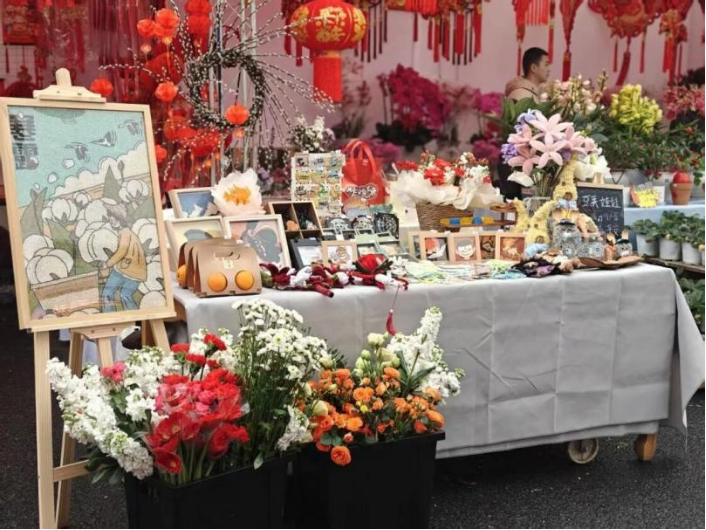 此外,“立园满园”工作站围绕人才共育与支持,以此次花市为契机为学生开展创业实践提供平台和机会。在年货市集区设立专属展位,展销年宵花、年礼及文创产品。年俗类与园艺特色文创产品,不仅丰富了花市年货品类,更有效锻炼了自身市场对接、产品营销等综合实践能力,实现了“专业学习-实践应用-产业转化”的闭环成长。