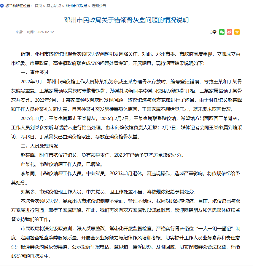 近期,邓州市殡仪馆出现骨灰领取失误问题引发网络关注。对此,邓州市委、市政府高度重视,立即成立由市纪委、市民政局、高集镇政府联合成立的问题处置专班,开展调查。现将调查处理结果说明如下: