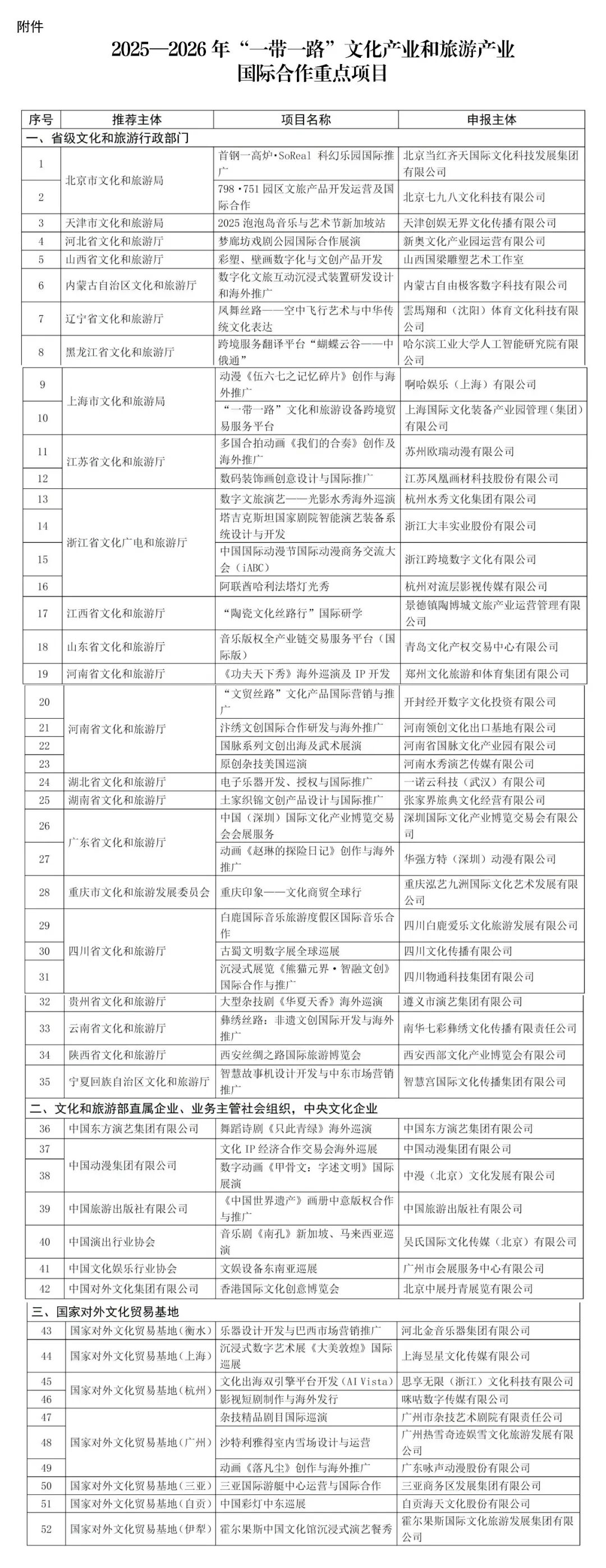 此次重点项目名单依据《文化和旅游部办公厅关于征集2025年“一带一路”文化产业和旅游产业国际合作重点项目的通知》(办产业函〔2025〕366号)要求,在各省级文旅行政部门、部直属企业、国家对外文化贸易基地建设主体等单位推荐申报的基础上,经过合规性审查、评审、公示等规范程序后确定。