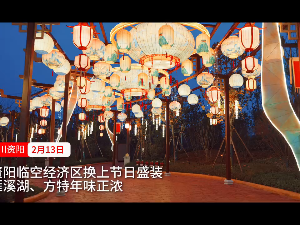 春节将至,资阳高新区新春景观布置完成。雁南湖公园、高速路口及主要道路两旁悬挂起大红灯笼和彩灯,广场上设置了迎新主题灯组,吸引市民驻足观看。夜幕降临,各色灯饰交相辉映,为城市增添喜庆祥和的节日氛围。