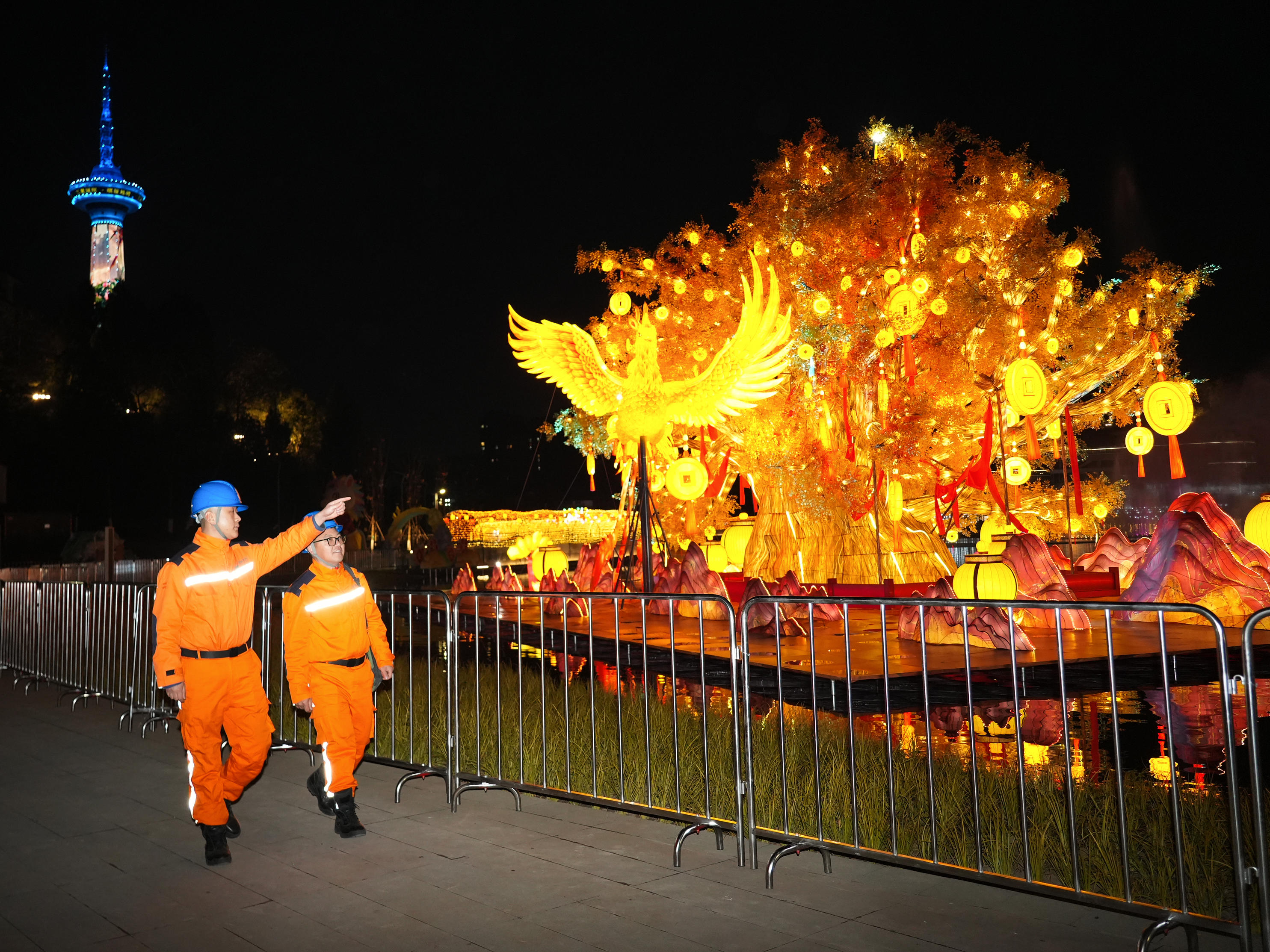 呼应马年新春和马年幸运数字“10”,本届灯会特别打造十匹“十全十美”主题瑞马,以“十骥”暗合“十全”,错落于五大灯区。《光佑天骐》以三星堆太阳轮为意象,黄金飞马逐光腾空;《星华瑞骥》鬃尾流光,幻彩柔雾环绕如从天降,寓意“骐骥开新程,瑞兆入新岁”。
