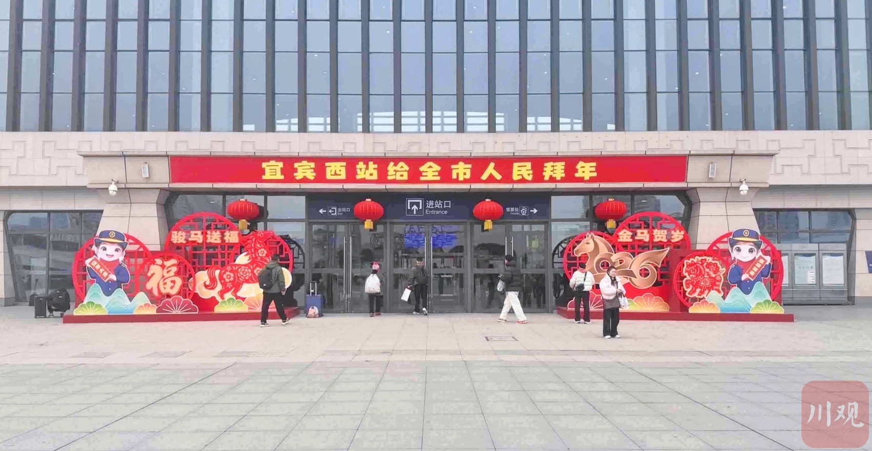 当天下午,宜宾西站出站口人流涌动。站台外,“宜宾西站向全市人民拜年”的标语前,不少刚下车的旅客举着手机拍照;站内,红灯笼、中国结早已挂上,年味扑面而来。