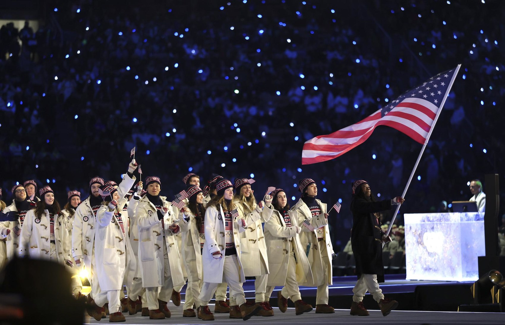 2月6日,美国体育代表团在米兰冬奥会开幕式上入场。图据新华社