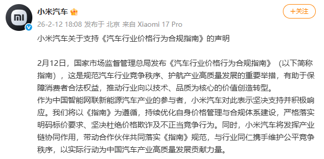 作为中国智能网联新能源汽车产业的参与者,小米汽车对此表示坚决支持并积极响应。我们将以《指南》为遵循,持续优化自身价格管理与合规体系建设,严格落实明码标价要求、坚决杜绝价格欺诈及不正当竞争行为。同时,小米汽车将发挥产业链协同作用,带动合作伙伴共同落实《指南》规范,与行业同仁携手维护公平竞争秩序,以实际行动为中国汽车产业高质量发展贡献力量。