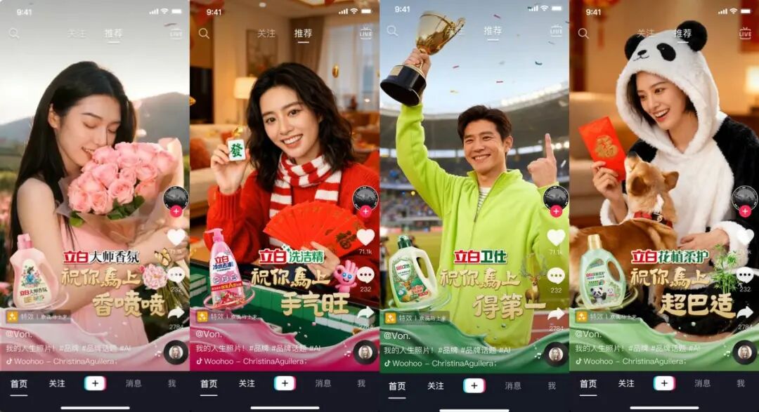 与此同时,立白还联动抖音平台,创新推出AIGC图生视频的特效玩法,将“所见即所得”的快乐进一步放大。用户通过“欢洗马上来”AI贴纸特效,只需轻轻一点,AI技术便能将“马上手气旺”、“马上得第一”“马上香喷喷”或是“马上超巴适”这些妙趣横生的标签和特效与个人照片相结合。