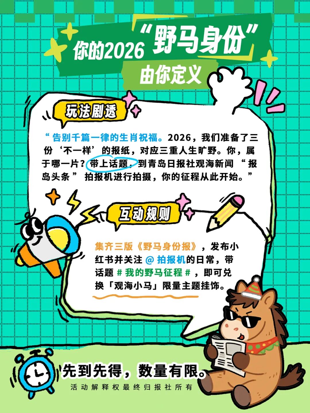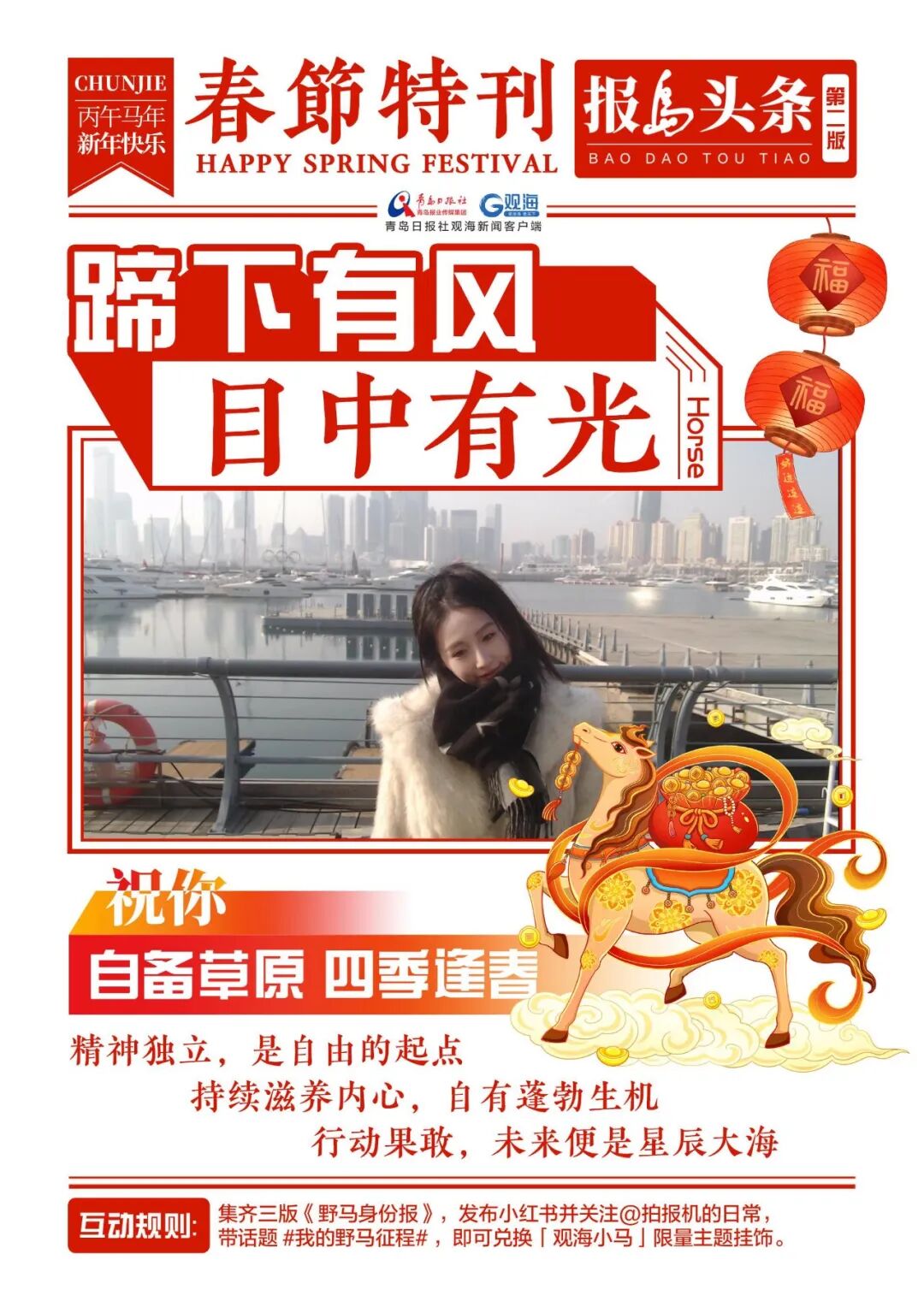 《野马身份报》上,马年祝福不再是千篇一律的“马到成功”,取而代之的是三句又飒又自由的话——“赛道之外,皆是原野”“蹄下有风,目中有光”“信步由缰,皆是好途”。