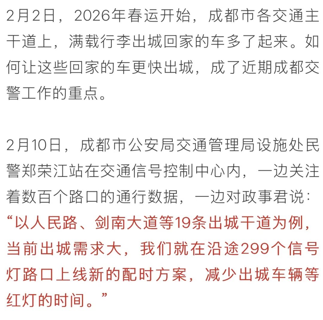 随着2026年春运启动,成都交警正式上线信号灯“春节模式”,这个模式究竟如何运作、红绿灯如何“读懂”春节?近日,政事君带着疑惑走进了成都市公安局交通管理局交通信号控制中心,只见民警郑荣江轻点鼠标,一套为春节量身定制的信号配时方案瞬间下发至遍布路口的信号机。