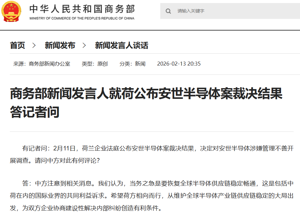 商务部新闻发言人就荷公布安世半导体案裁决结果答记者问
