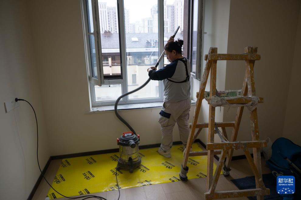 资料图:保洁员在一间新房内用吸尘器吸窗纱上的灰尘。(新华社图)