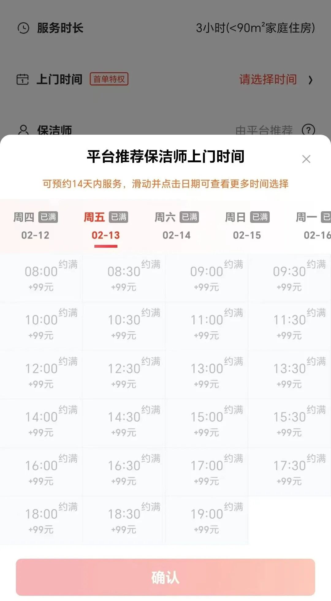以某线上平台的2小时家政服务项目为例,官方价格为96元,春节档期需要额外支付39—99元服务费。记者13日在下单之后试图预约时,发现最快也只能约到下周一(2月16日)。