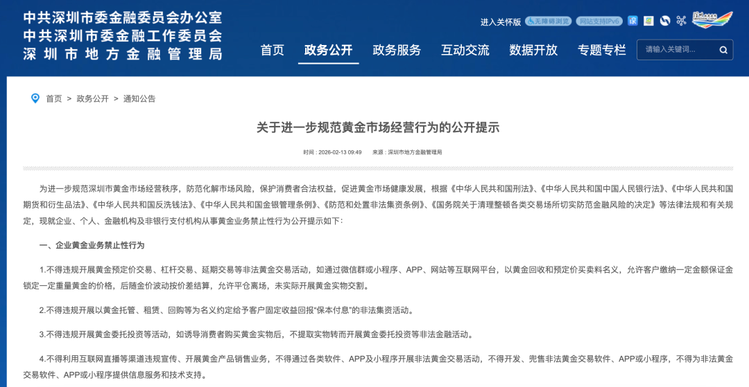 2月13日,深圳市地方金融管理局、中国人民银行深圳市分行等10部门发布关于进一步规范黄金市场经营行为的公开提示。
