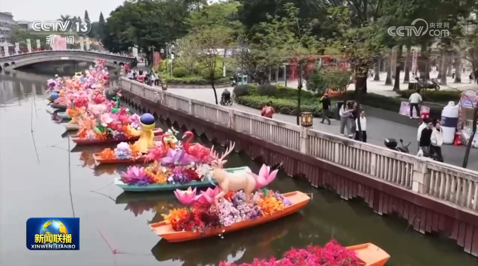 在广东佛山南海里水镇,岭南新春水上花市开启。龙舟花舫、七彩花艇满载着鲜花,穿梭在河道之上。今年的水上花市还打造近30组水陆花灯,让人们沉浸式体验岭南水乡的年味。