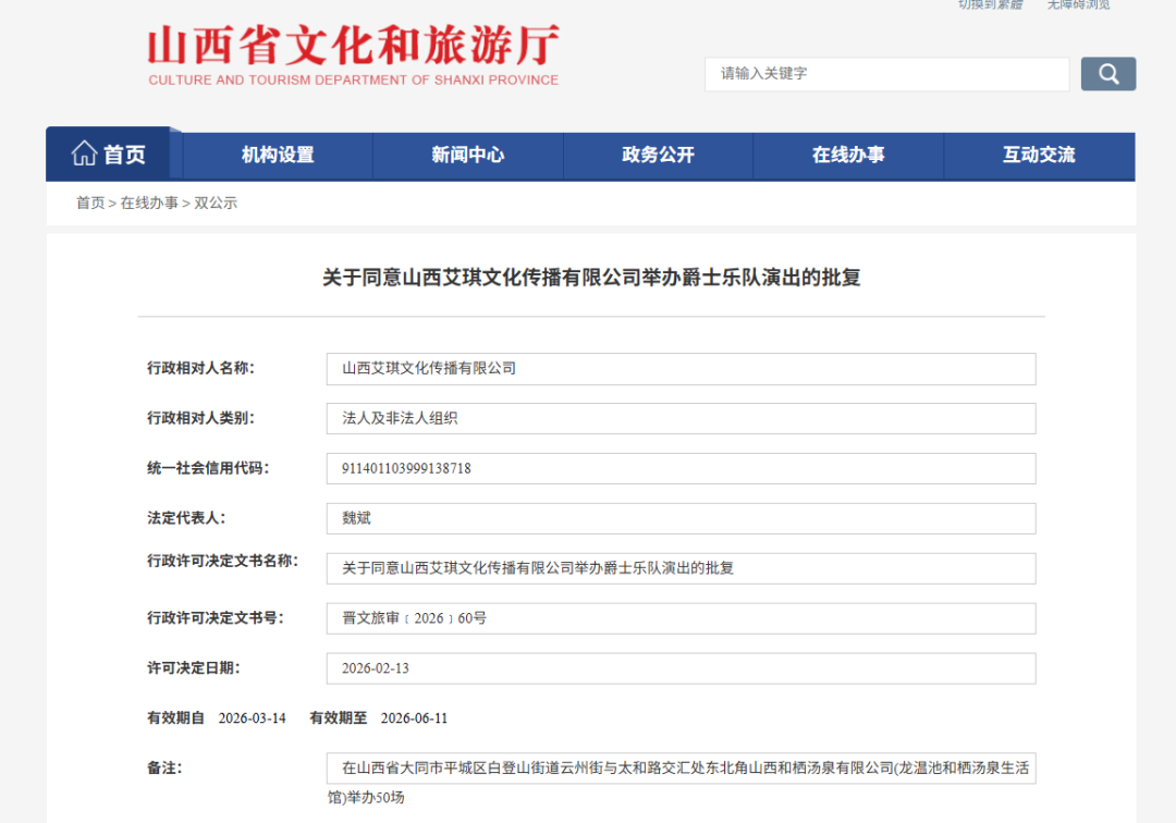 2月13日,山西省文化和旅游厅批复多场演出。具体如下: