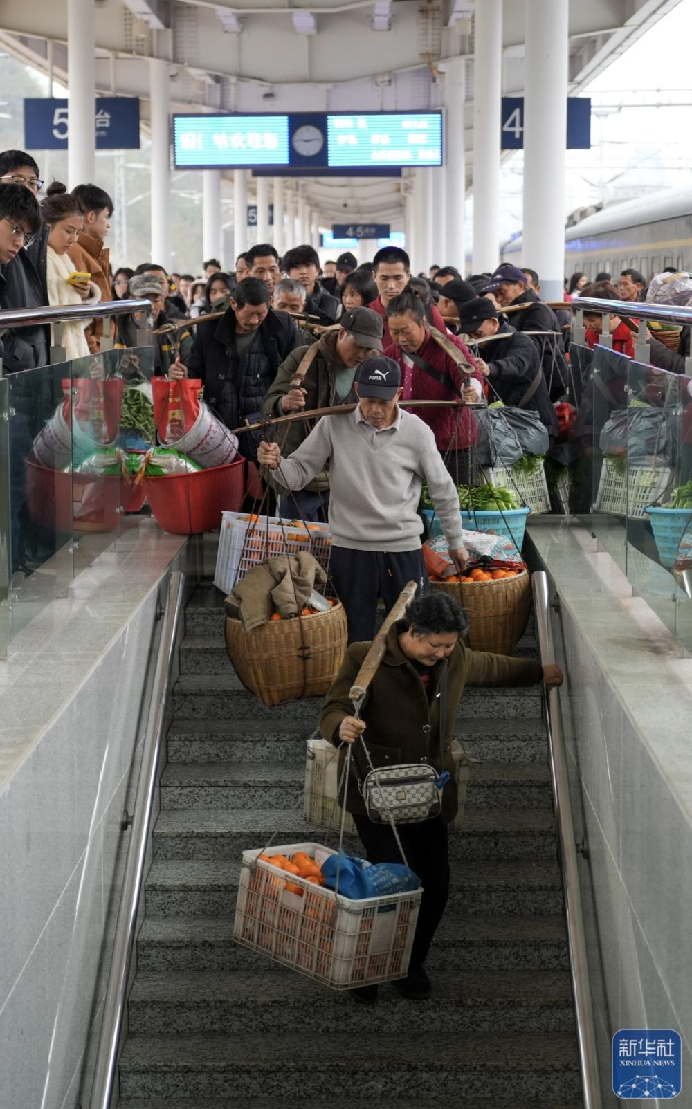 ↑ 2月12日,在贵州省铜仁市铜仁站,来自湖南的菜农挑着果蔬出站。新华社发(袁福洪 摄)