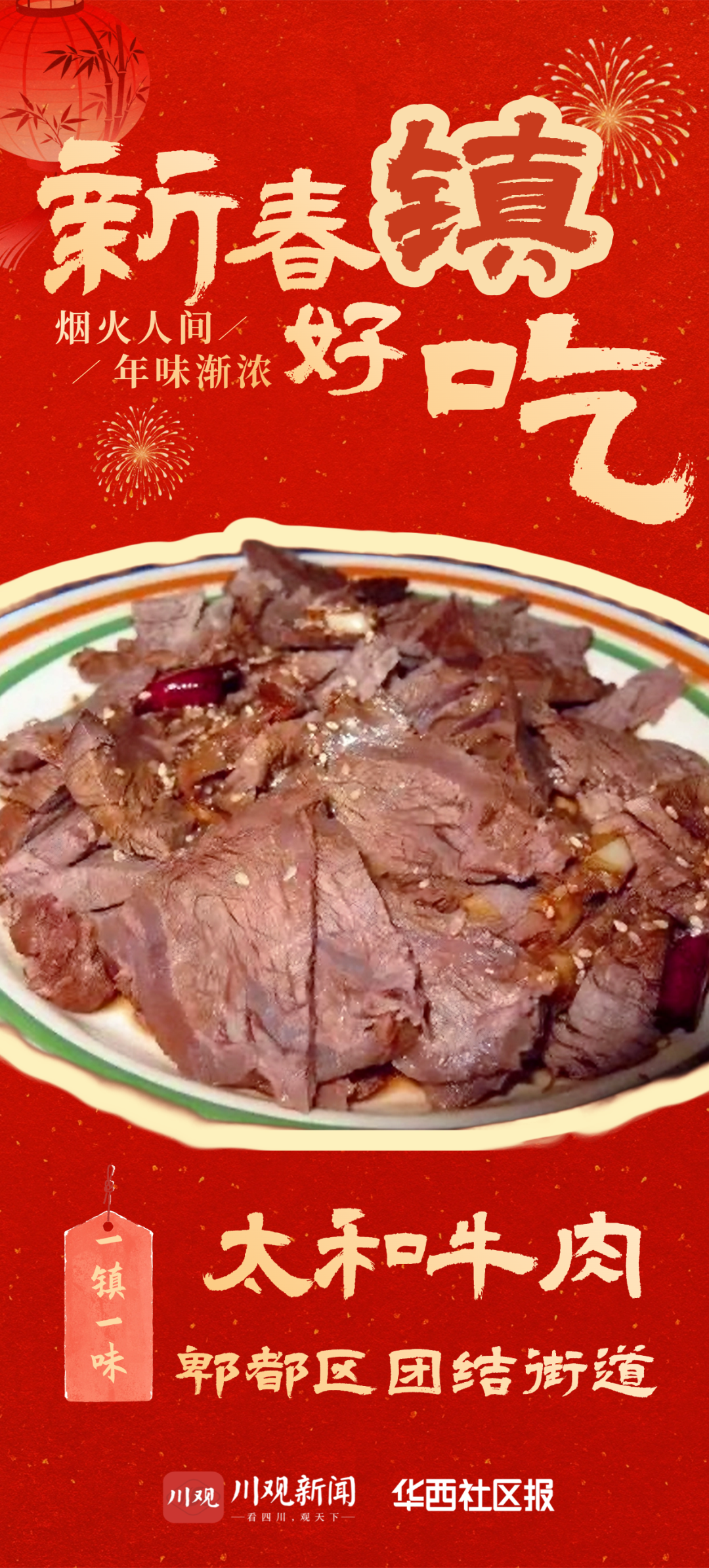 本期,我们走进郫都区团结街道、武侯区浆洗街街道、简阳市平武镇、大邑县新场镇、新都区新繁街道,探寻五道极具代表性的“镇桌年菜”。从传承数百年的太和牛肉与千年泡菜古法,到充满市井智慧的肥肠血旺与麻椒脆鳝,再到带动乡村振兴的柴火鸡产业链,这些美食不仅记录了街镇的岁月年轮,更在守正创新中焕发出时代活力,成为解码成都人文底蕴与产业发展的生动注脚。