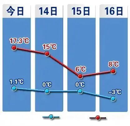 15-16日早晨,北部和东部地区最低气温下降5~8℃,其中张家口北部和承德坝上地区下降9~11℃,其他地区最低气温下降2~4℃。