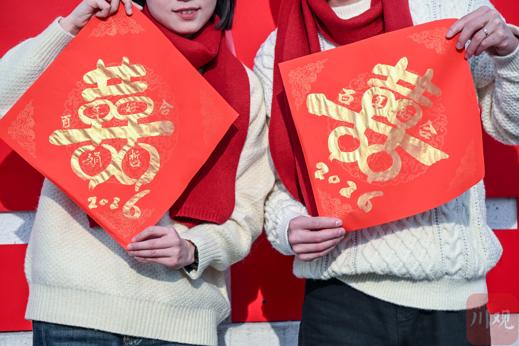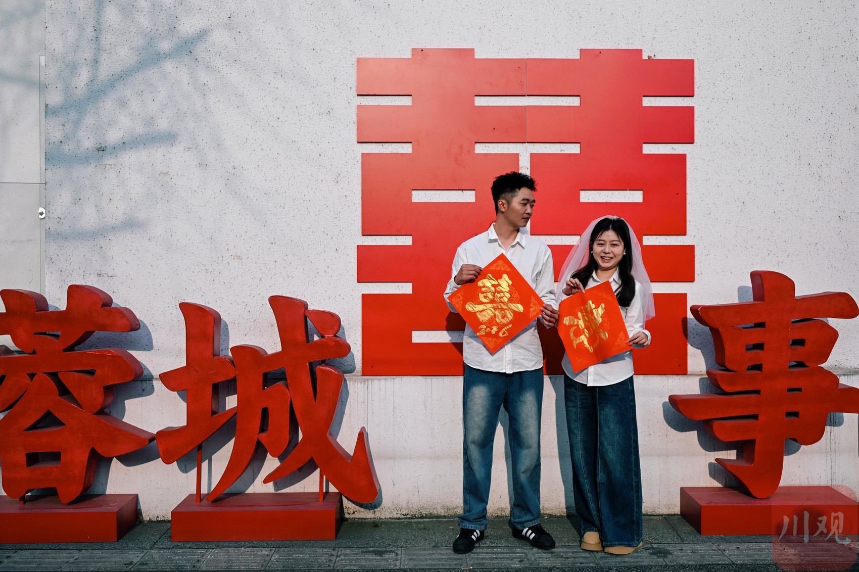 一对新人手拿现场书写的“喜”字拍照。