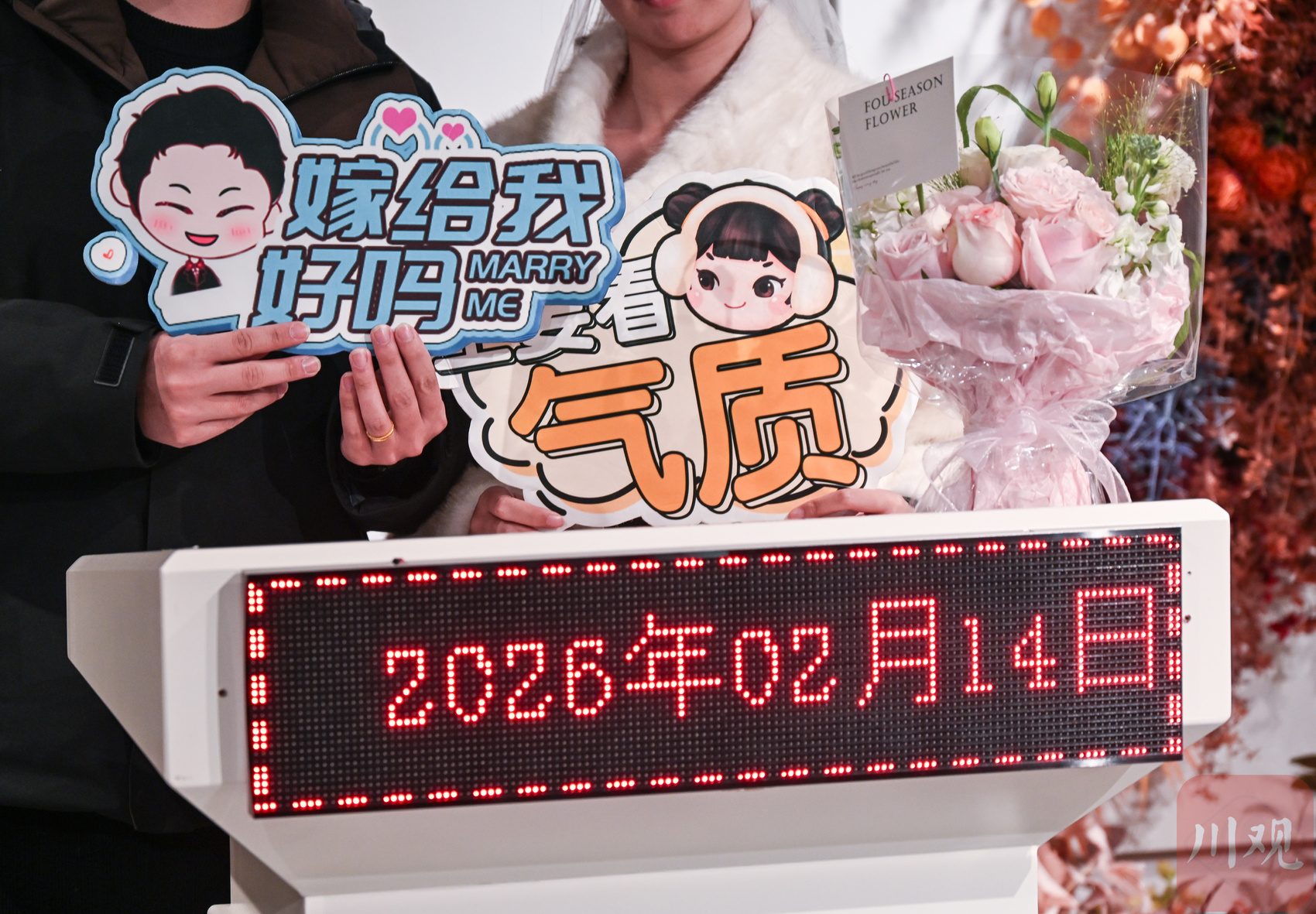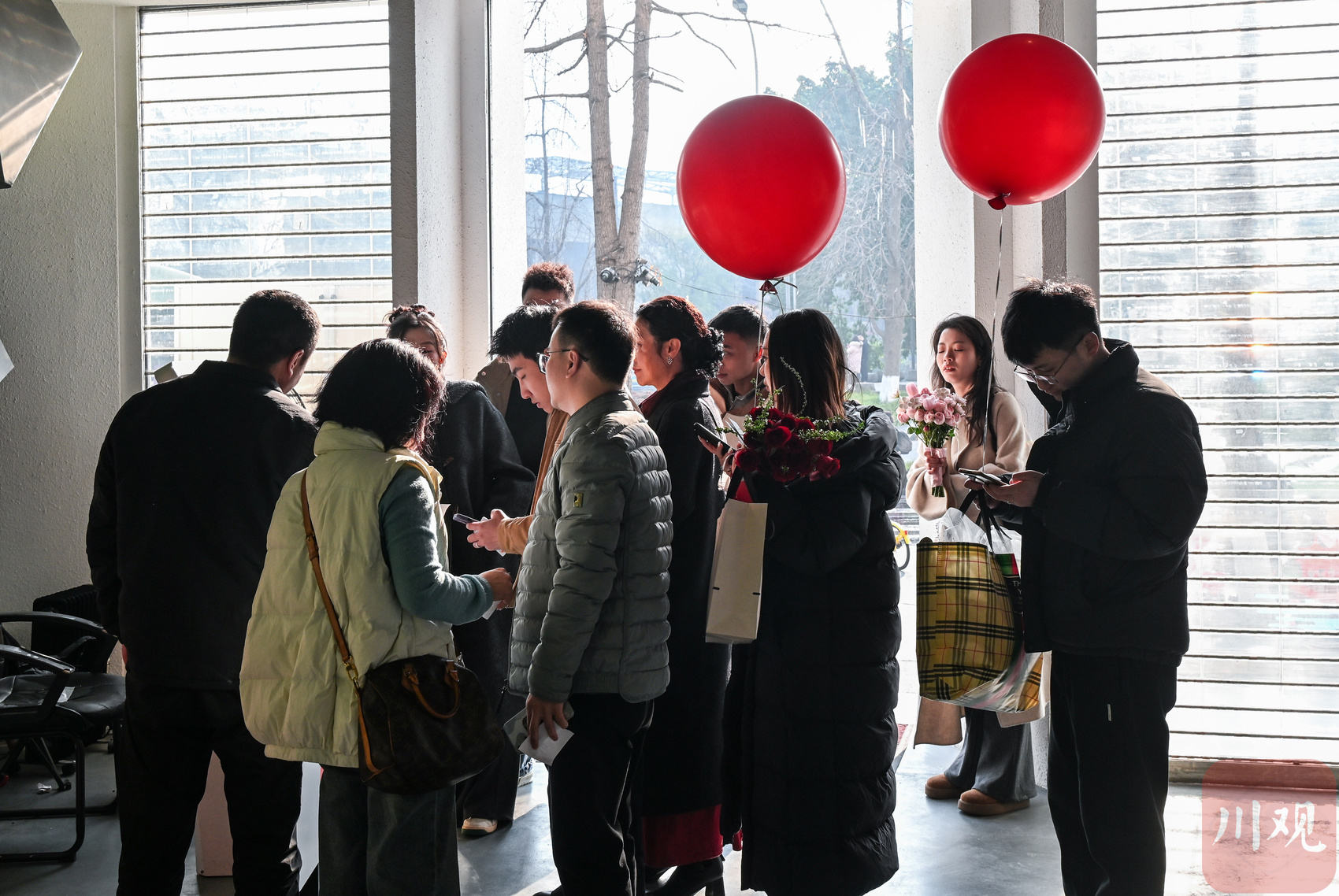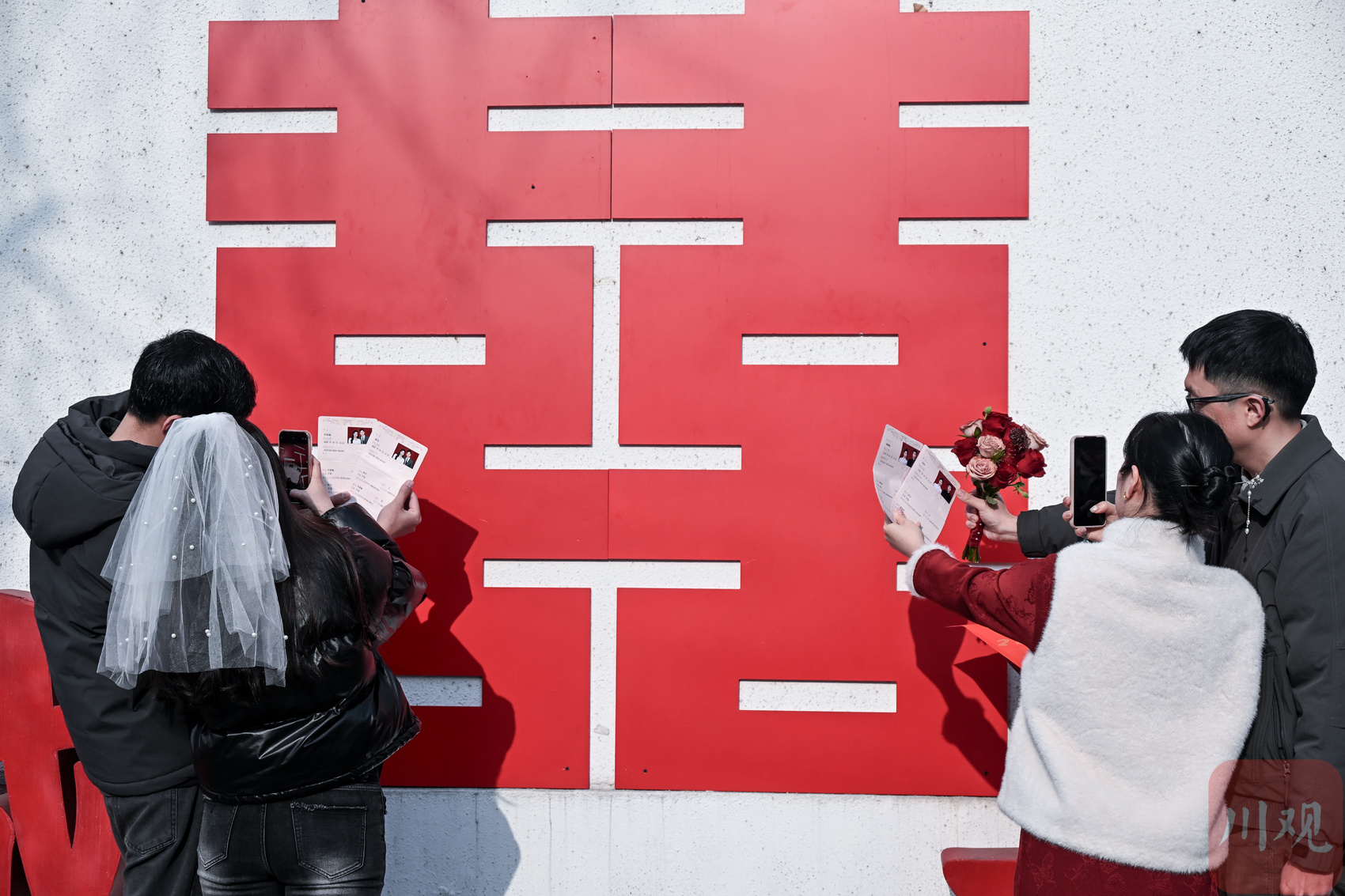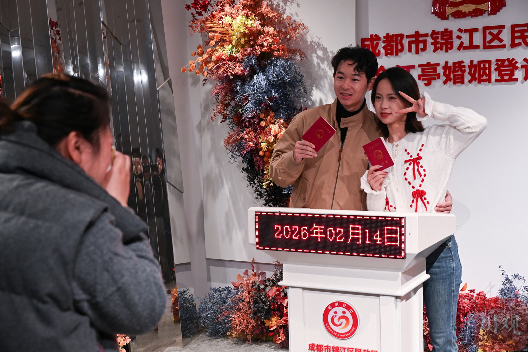 2月14日,在成都市合江亭婚姻登记处,多对新人排队领证。随着春节的临近,30多对年轻人都选择了这个日子领取结婚证。在现场,来自云南的黄凯程向川观新闻记者表示,“我们早就定好了这天领证,既图个浪漫,也想借新春喜气,娶了老婆就回云南老家过年。”当日,在成都市区各个婚姻登记处也推出延时服务,方便新人赶在农历新年前完成登记。