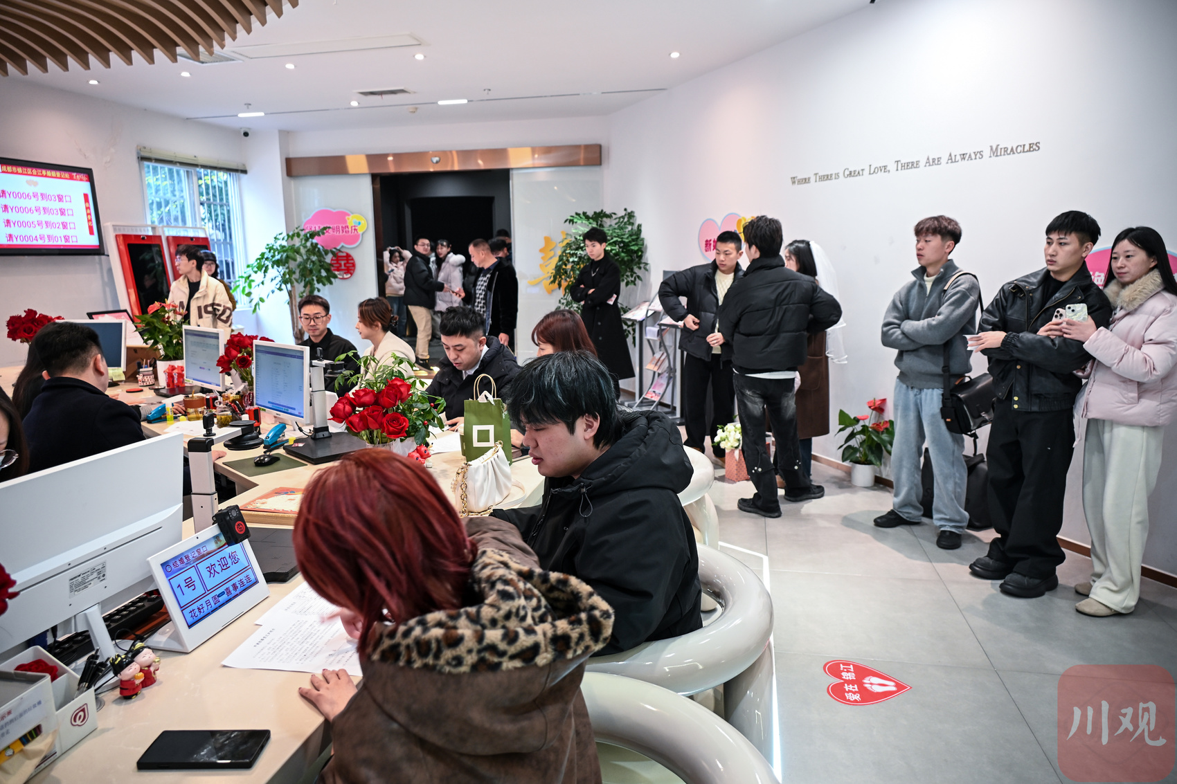 合江亭婚姻登记处内新人排队领证。