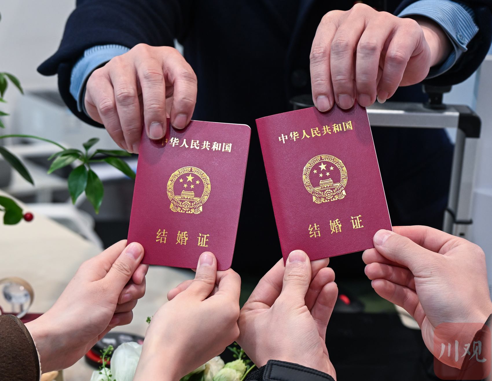 一对新人领取结婚证。