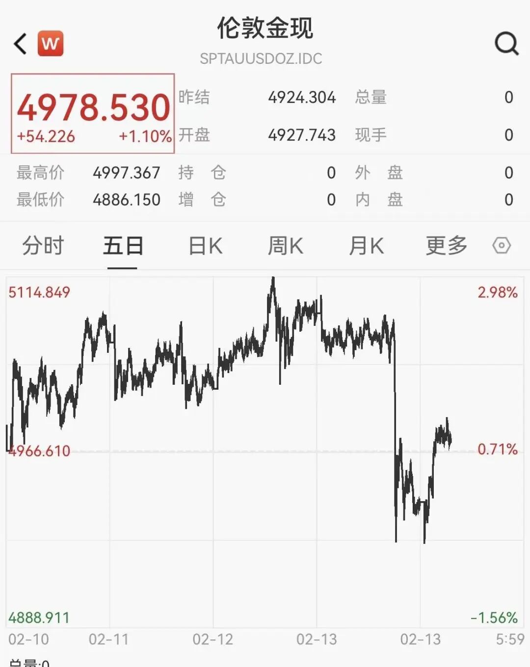 2月12日,伦敦金全日下跌3.17%,跌破5000美元/盎司。截至13日发稿,伦敦金于4979美元/盎司附近震荡。