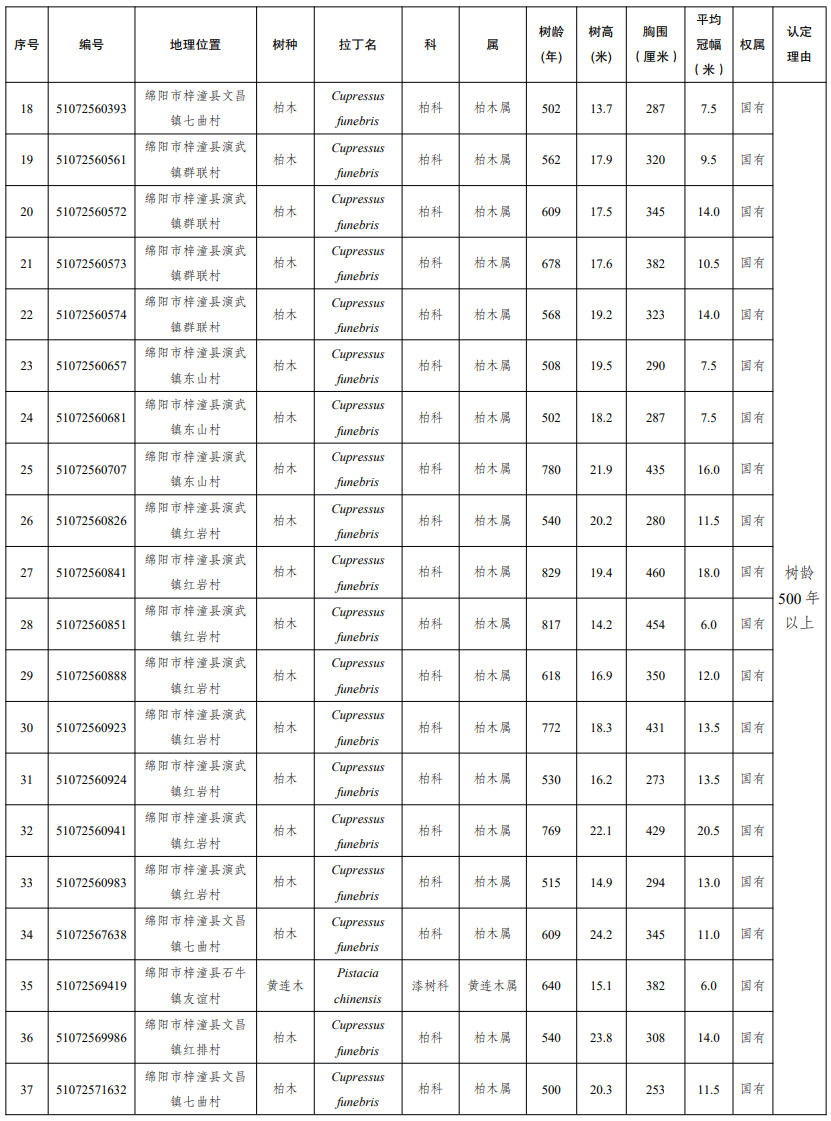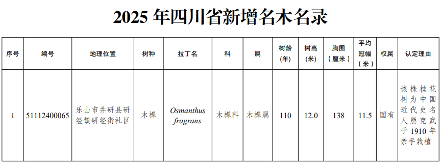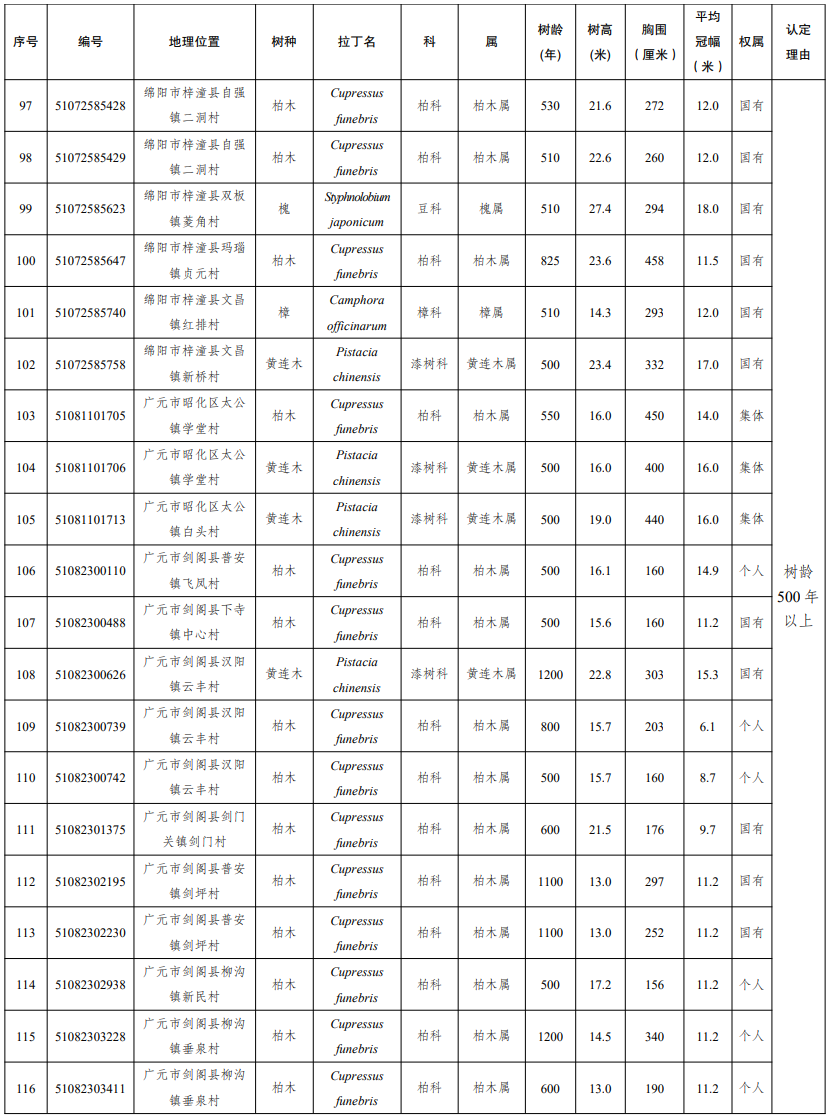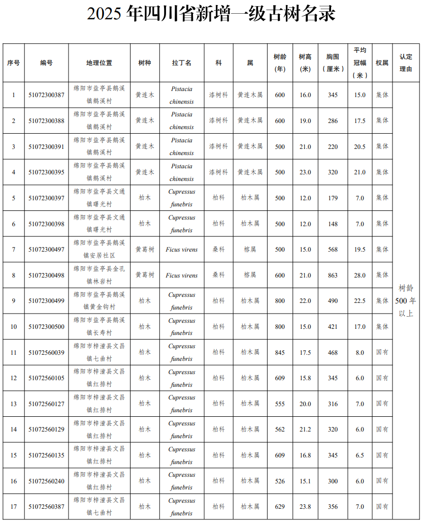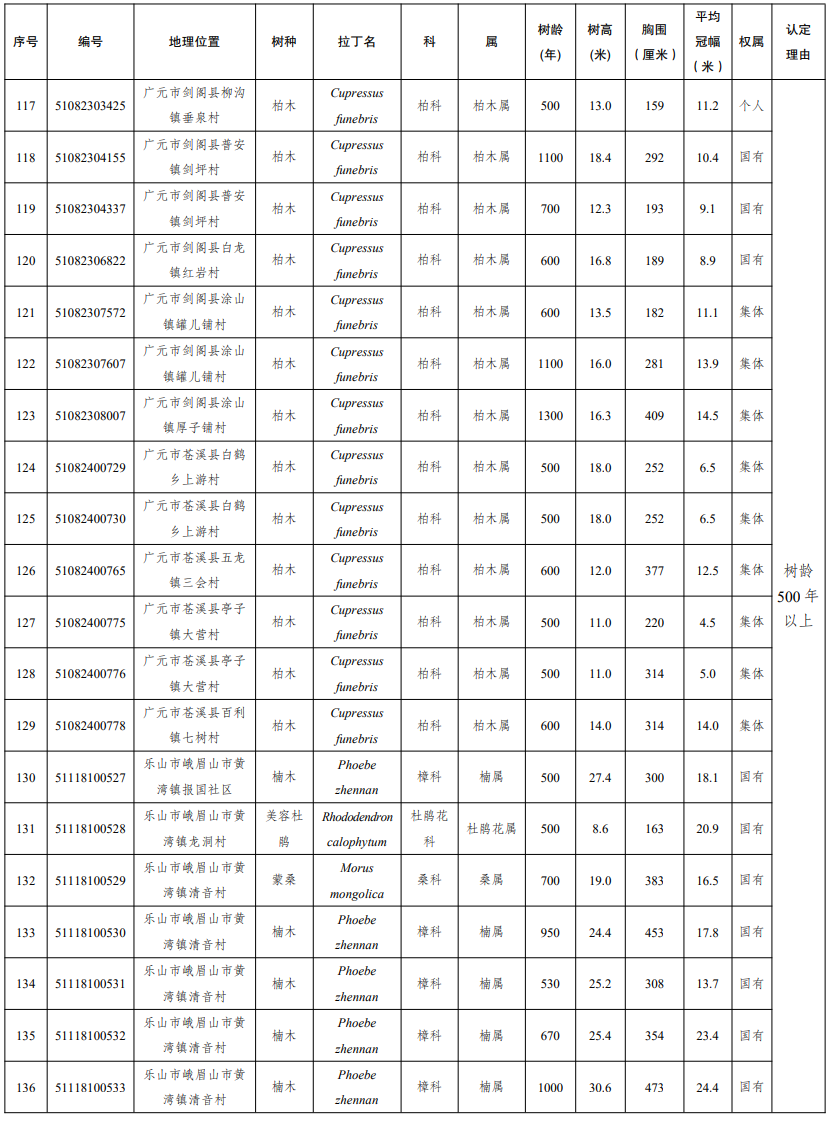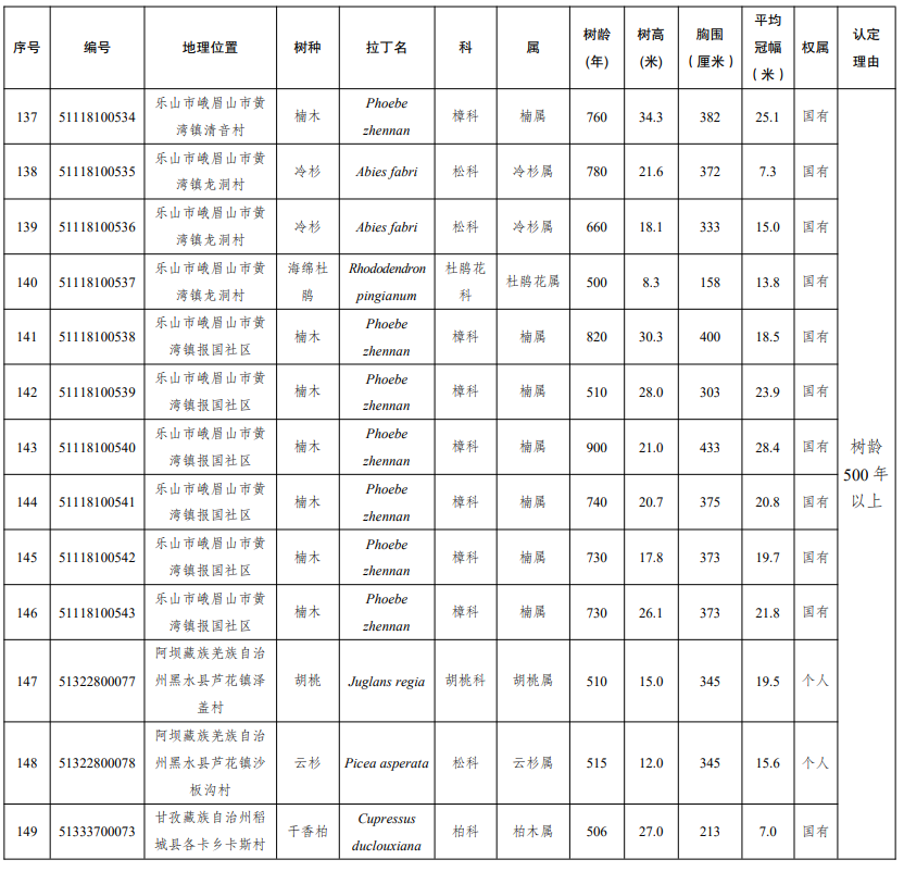 近日,四川省人民政府发布通告,公布2025年四川省新增一级古树及名木名录。2025年新认定四川省一级古树149株,名木1株。其中,树龄最大的古树为广元市剑阁县涂山镇厚子铺村的柏木,树龄1300年。