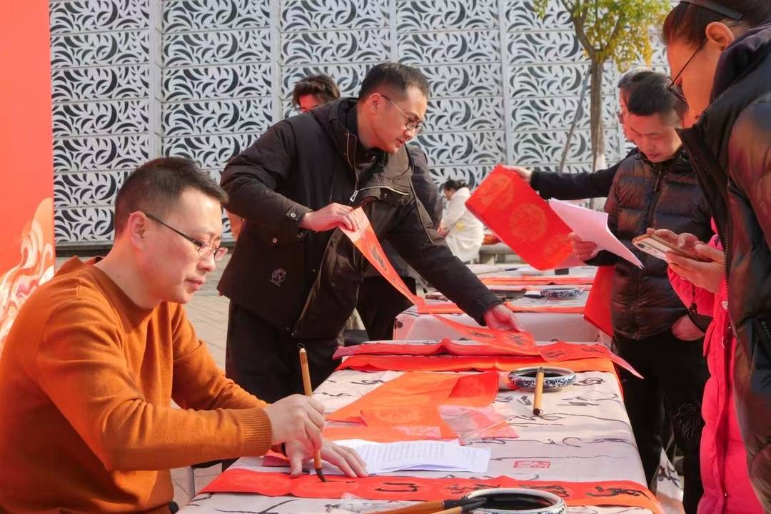 “春联迎新春·文化进万家”文旅志愿服务活动现场人头攒动,墨香飘溢,气氛热烈。书法家们挥毫泼墨、凝神动笔,将新春的祝福和美好的祝愿融入一副副春联和一张张“福”字当中。