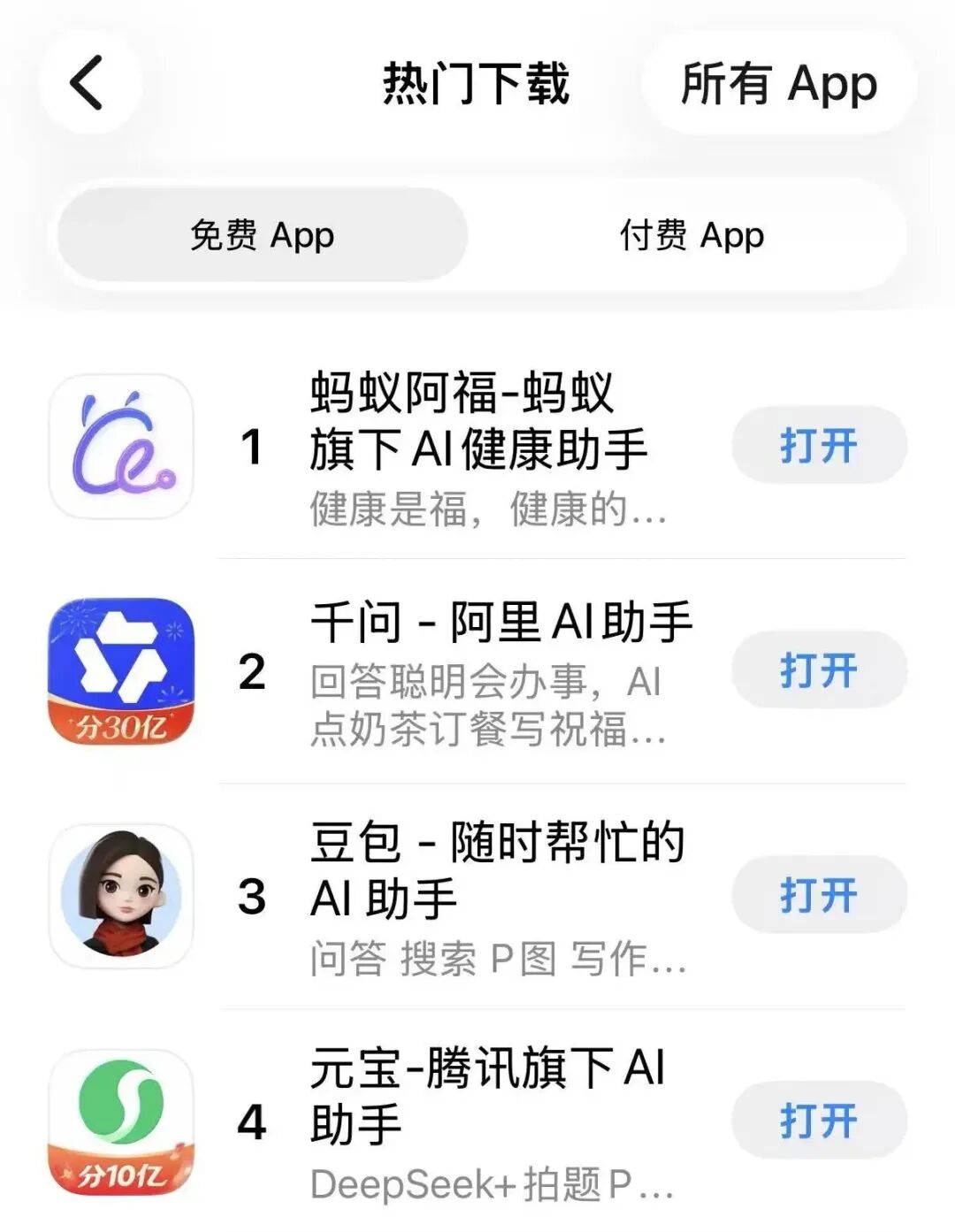 值得注意的是,榜单前四名均为AI应用,千问位居第二,豆包、元宝分列第三、第四。