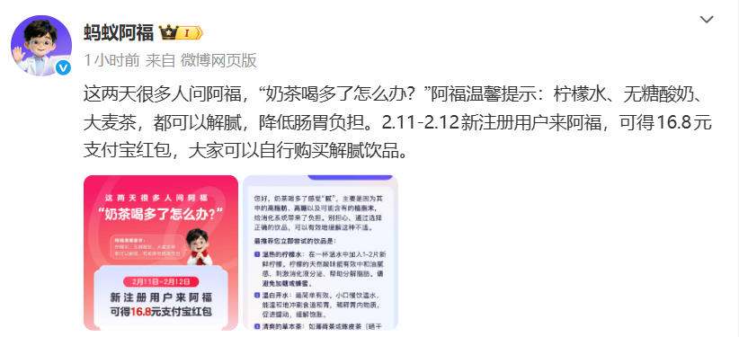 此前2月11日,蚂蚁阿福开启支付宝红包活动 ,2月11日-2月12日新注册用户在阿福可得16.8元支付宝红包。