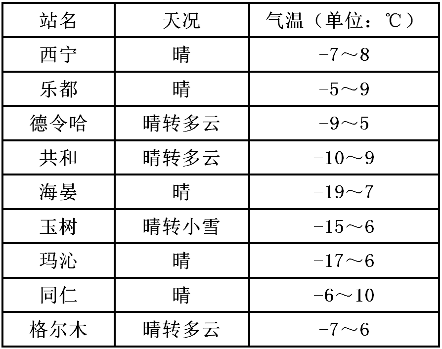 今天夜间,全省各地晴或多云。明天白天,玉树大部及达日、玛多、玛沁的部分地区有小雪或阵雪(0.1~2.4毫米),省内其余地区晴或多云。日最高气温将下降2~4℃,局地可达6℃以上。