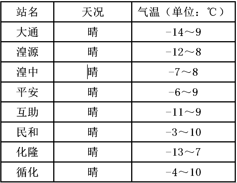 15日20时-16日20时:德令哈市、大柴旦、天峻、祁连、门源、刚察的部分地区有小雪或阵雪(0.1~2.0毫米),省内其余地区晴或多云。
