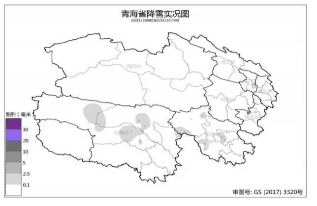 2月12日08时至2月13日08时,全省各地降水量在0.1~0.4毫米之间,其中小雪21站次。最大降水量出现在五道梁、治多扎河、达日桑日麻乡向阳村、甘德柯曲镇达协村,降水量为0.4毫米;城镇最大降水量出现在甘德, 降水量为0.3毫米。