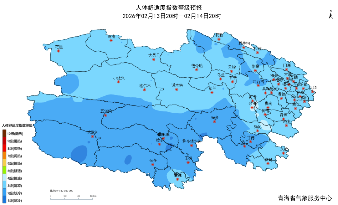 人体舒适度指数:13日20时至14日20时:玉树大部、玛多、甘德、达日为2级(较冷),体感偏冷,注意头面手部保暖。省内其余区域为3级(清凉),早晚注意保暖。