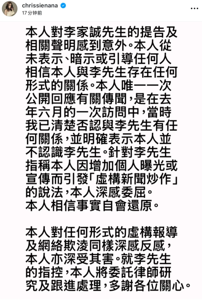 2月13日晚,周秀娜在社交平台回应:本人对李家诚先生的提告及相关声明感到意外。本人从未表示、暗示或引导任何人相信本人与李先生存在任何形式的关系。本人唯一一次公开回应有关传闻,是在去年六月的一次访问中,当时我已清楚否认与李先生有任何关系,并明确表示并不认识李先生。