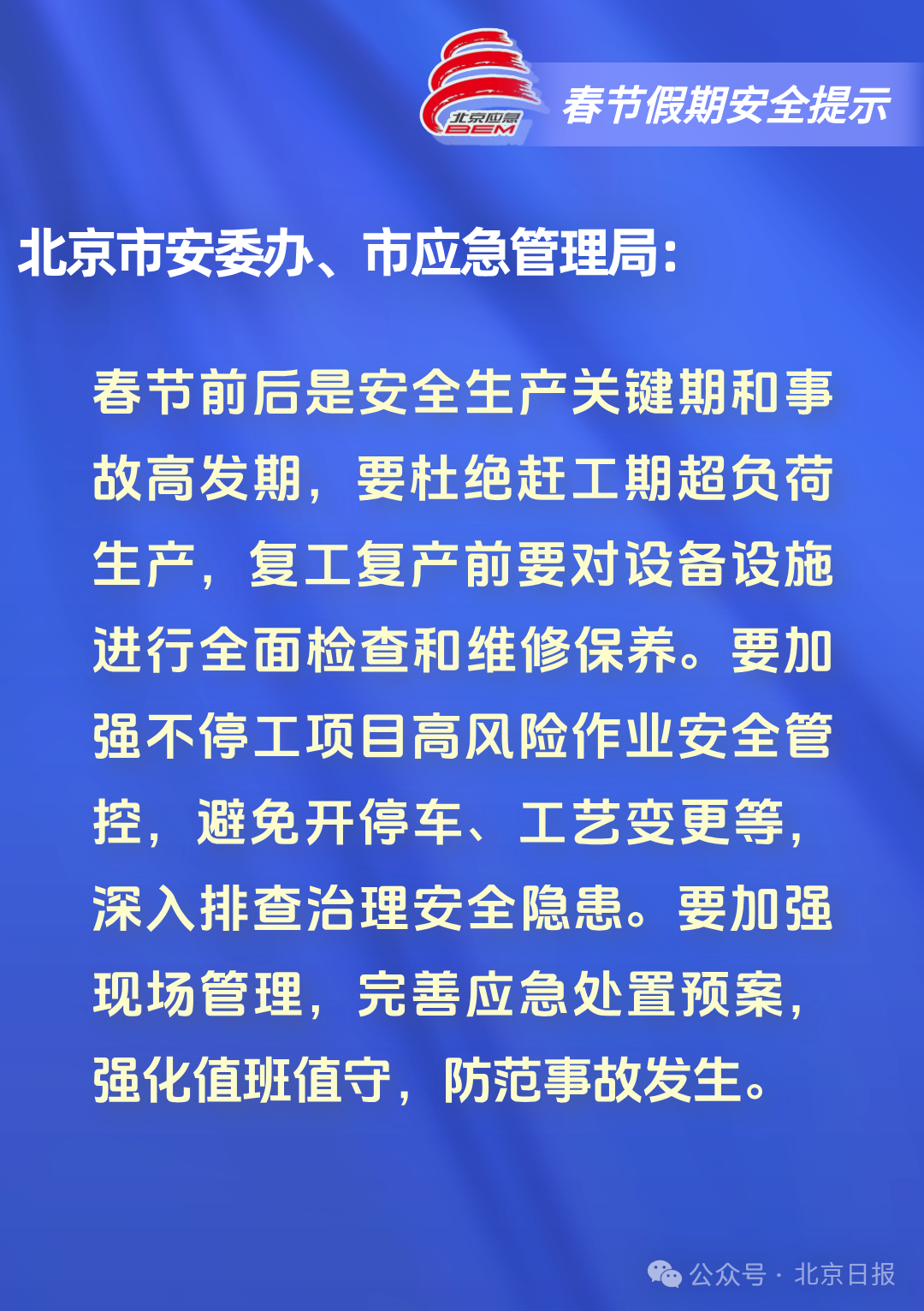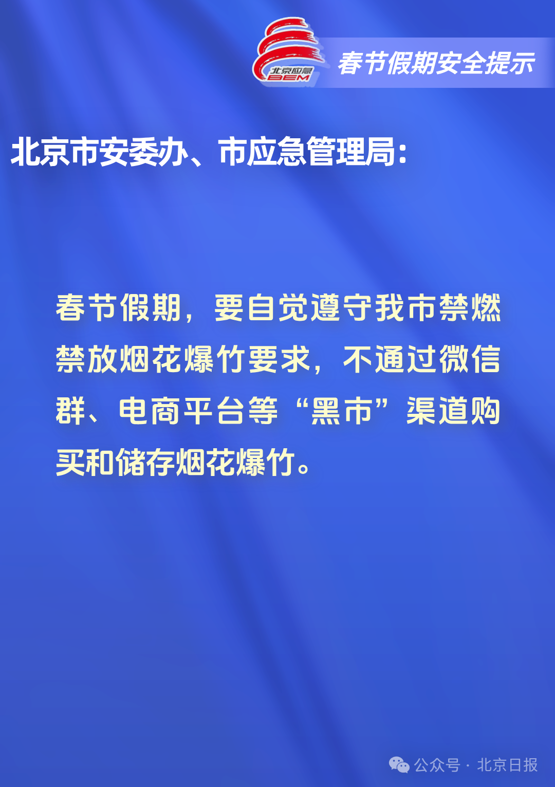 北京市安委办、市应急管理局温馨提示:春节期间,请安全文明出行,有序参与节庆活动,注意居家用火用电及燃气安全,自觉遵守烟花爆竹禁燃禁放规定,平安祥和欢度新春。来源:北京市安委办、市应急管理局