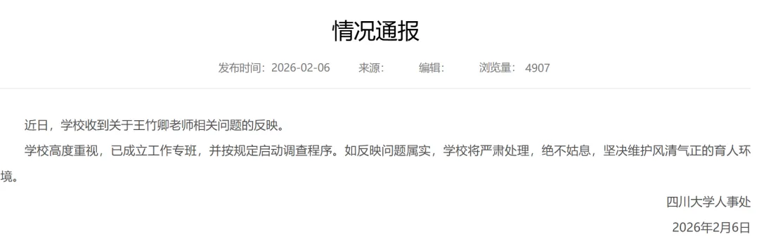 2月6日,四川大学人事处发布情况通报称,近日学校收到关于王竹卿老师相关问题的反映。学校高度重视,已成立工作专班,并按规定启动调查程序。
