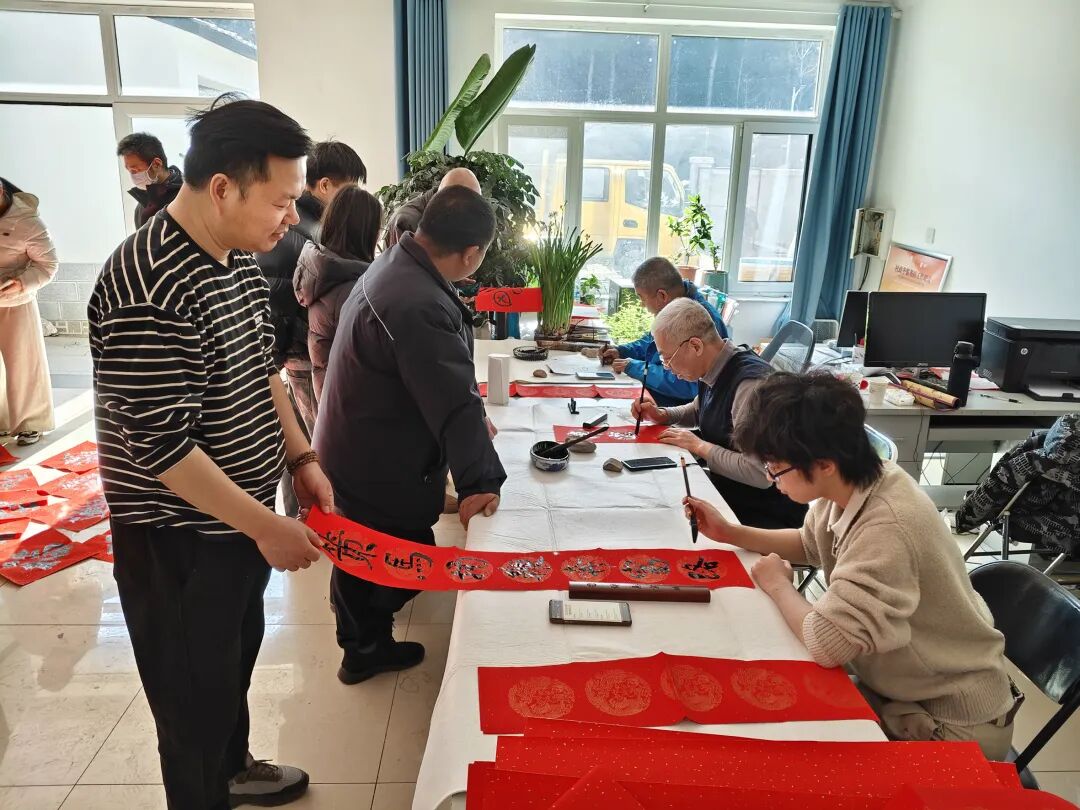 新春将至,年味儿暖心。大家齐动手,打来熬好的浆糊,把春联贴在村委会大门口。进到屋里,村民们纷纷上前,请志愿者写春联。