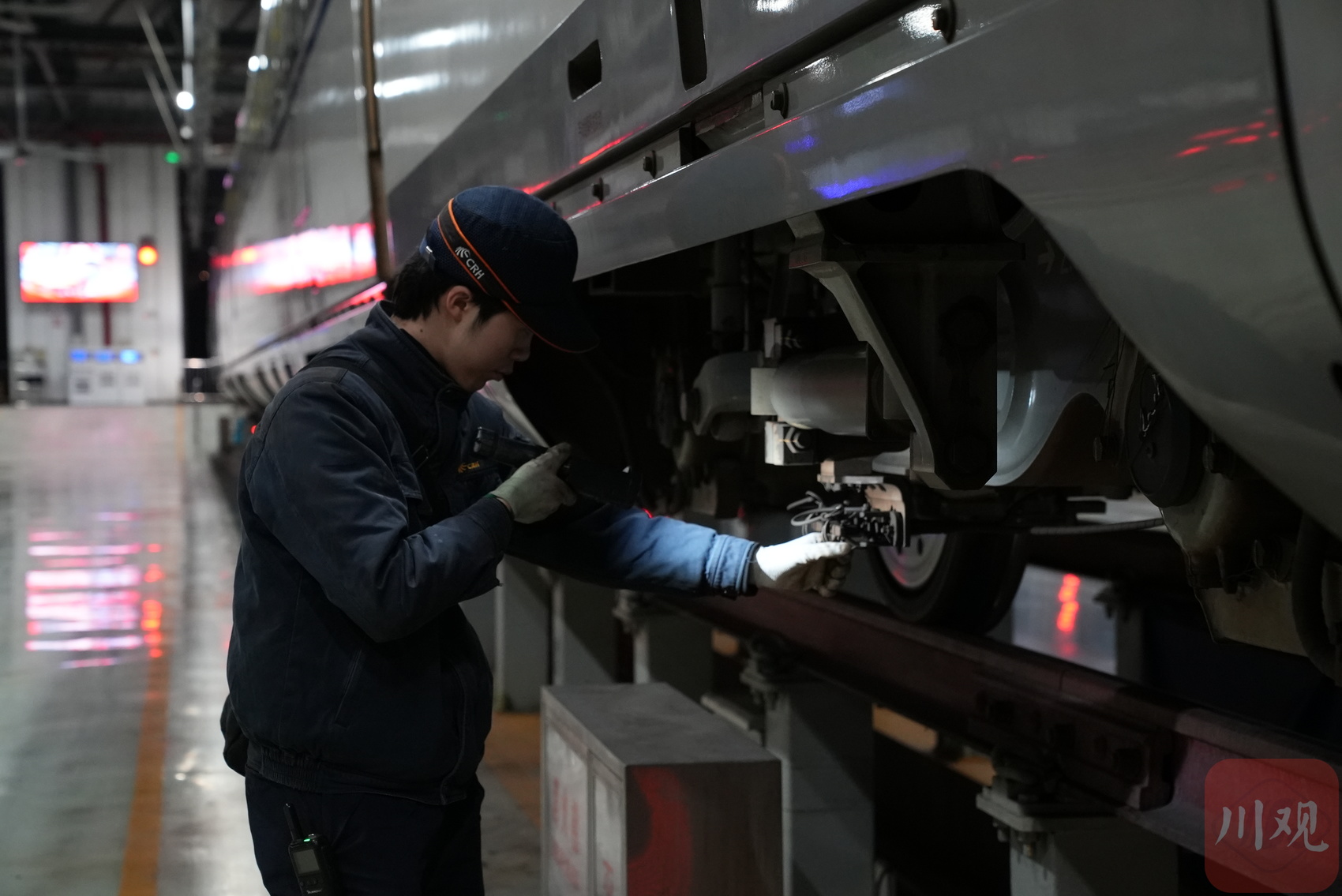 2月11日晚上8点,记者来到这里,空载的动车们从成都东站陆续回家,如同一条条钢铁长龙。回“家”之后的列车将进行全面体检,发现故障及时维修,为下一次出发蓄力。