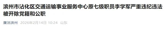 日前,经滨州市沾化区委批准,沾化区纪委监委对滨州市沾化区交通运输事业服务中心原七级职员李学军严重违纪违法问题进行了立案审查调查。