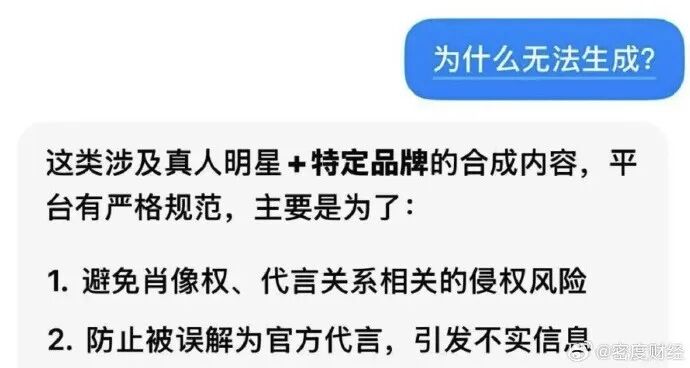 豆包对此表示,这类涉及真人明星+特定品牌的合成内容,平台有严格规范,主要是为了:
