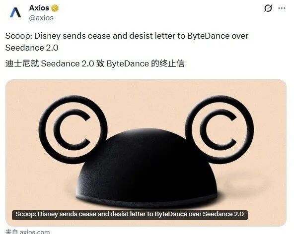 据九派新闻援引美国新闻网站Axios报道,华特迪士尼公司于当地时间2月13日向字节跳动发函,指控对方在训练和开发Seedance 2.0模型时未经许可使用迪士尼作品,要求字节跳动“停止侵权且不得再犯”。
