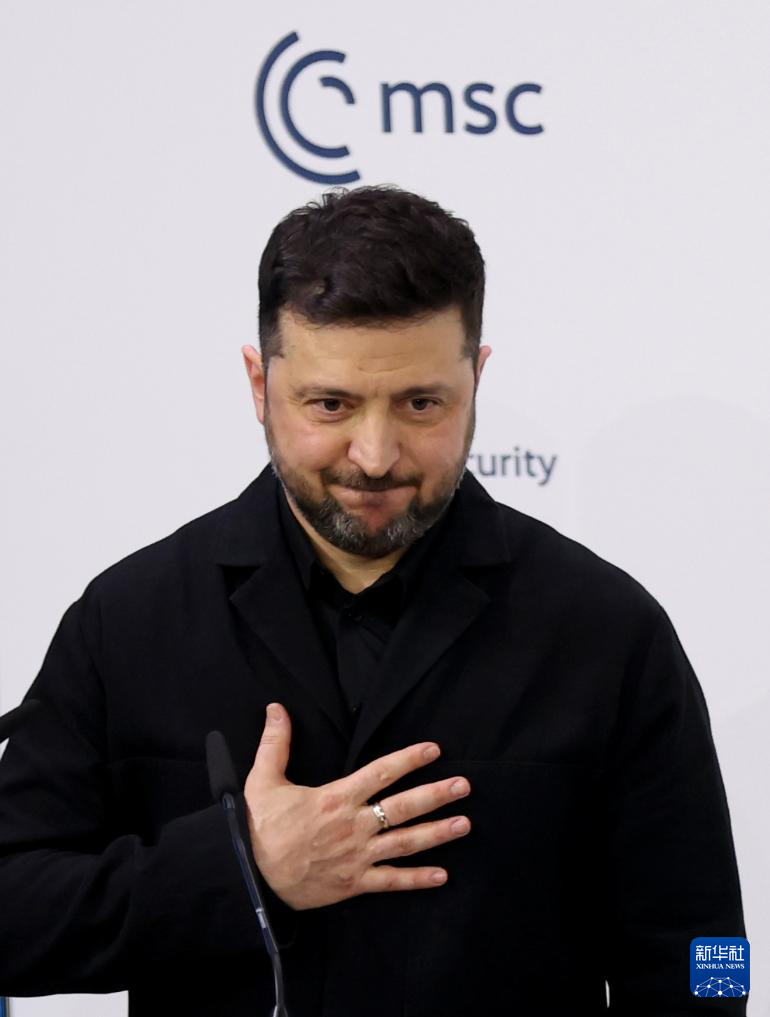 2月14日,在德国慕尼黑,乌克兰总统泽连斯基在慕尼黑安全会议上发表讲话后向观众致意。 新华社记者 李颖 摄