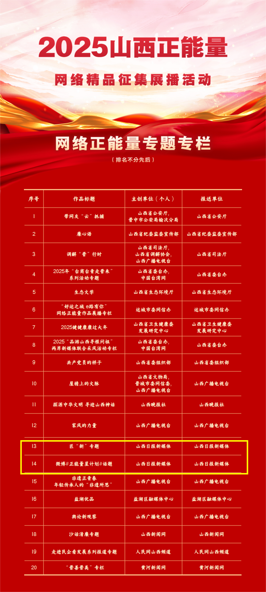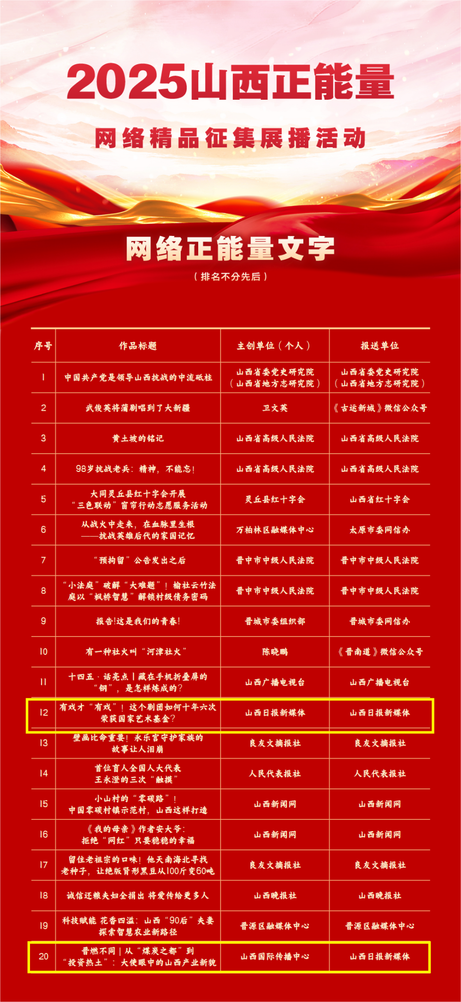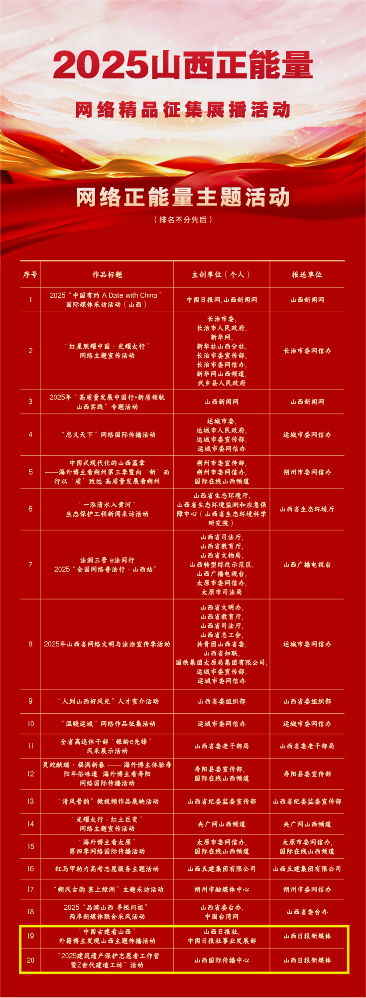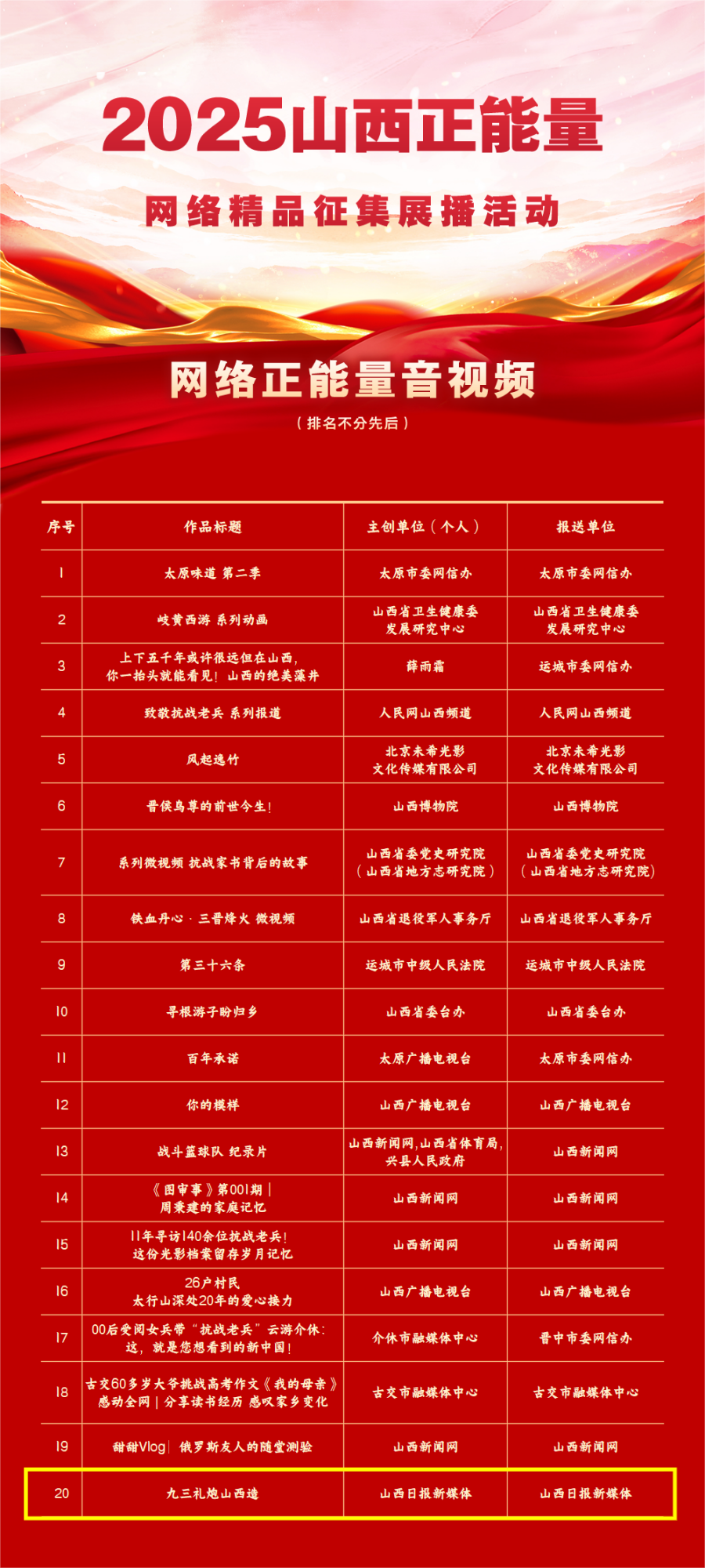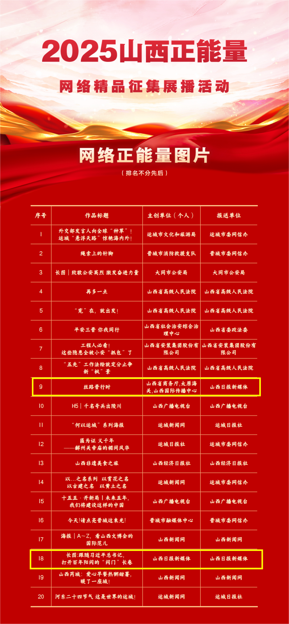 活动共征集到山西省各地各单位以及新闻媒体、商业网站平台、MCN机构、正能量网络名人、优质网络主播等报送作品831件,经过多轮专家评审和结果公示等环节,选出文字、图片、音视频、专题专栏、主题活动共五大类100件网络精品。名单如下:
