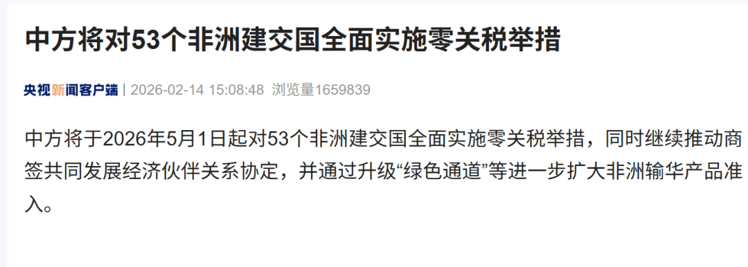 中方将于2026年5月1日起对53个非洲建交国全面实施零关税举措,同时继续推动商签共同发展经济伙伴关系协定,并通过升级“绿色通道”等进一步扩大非洲输华产品准入。